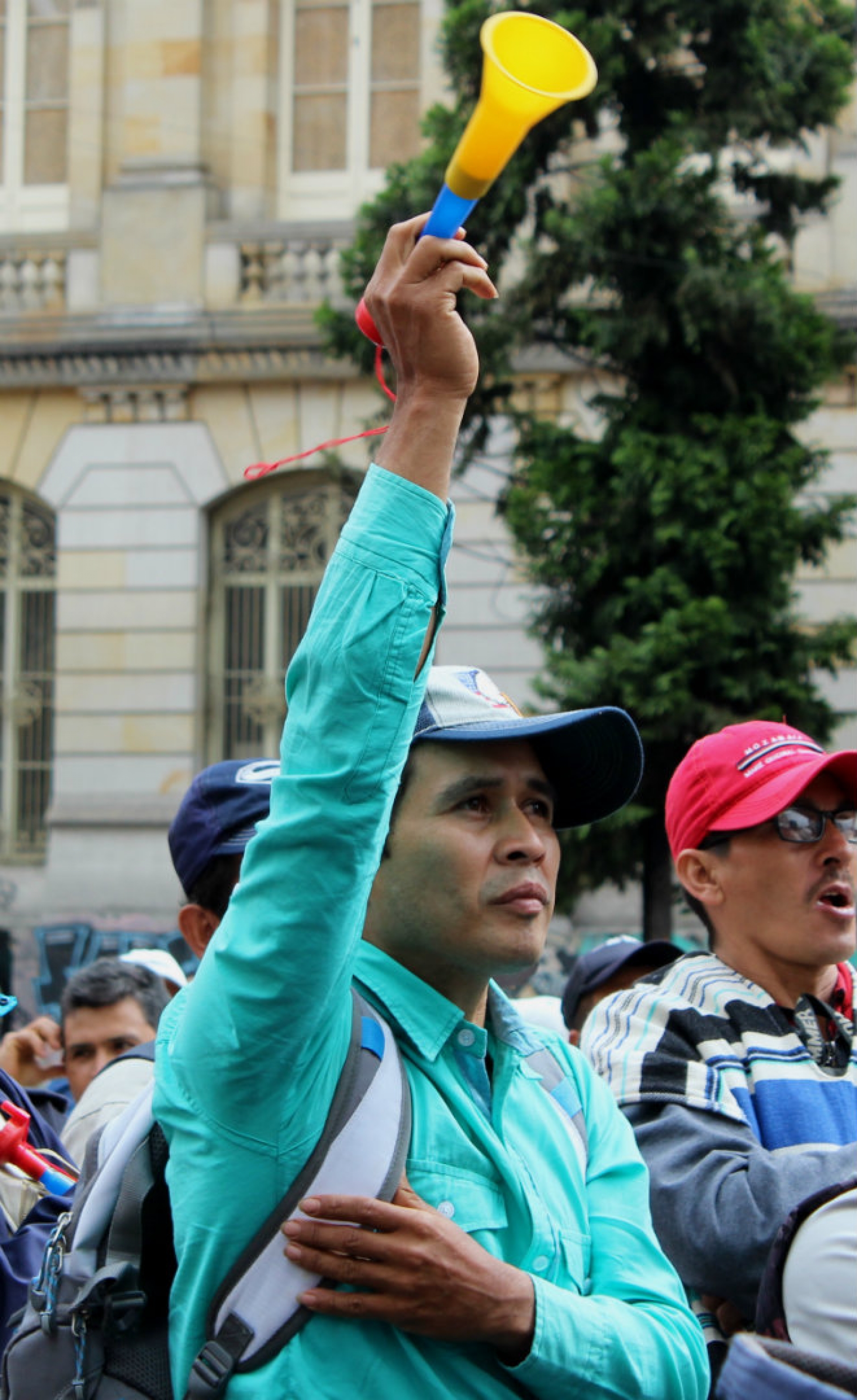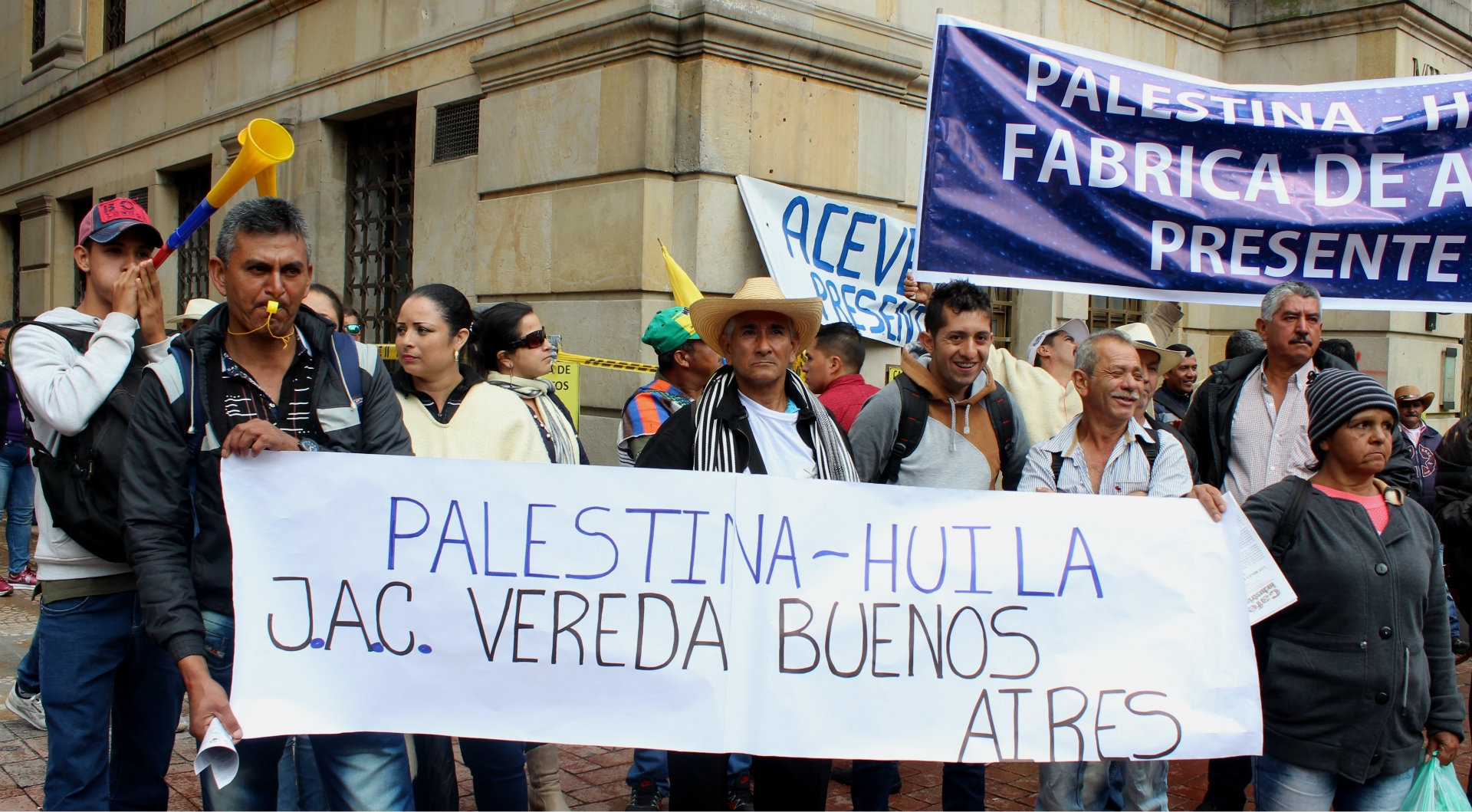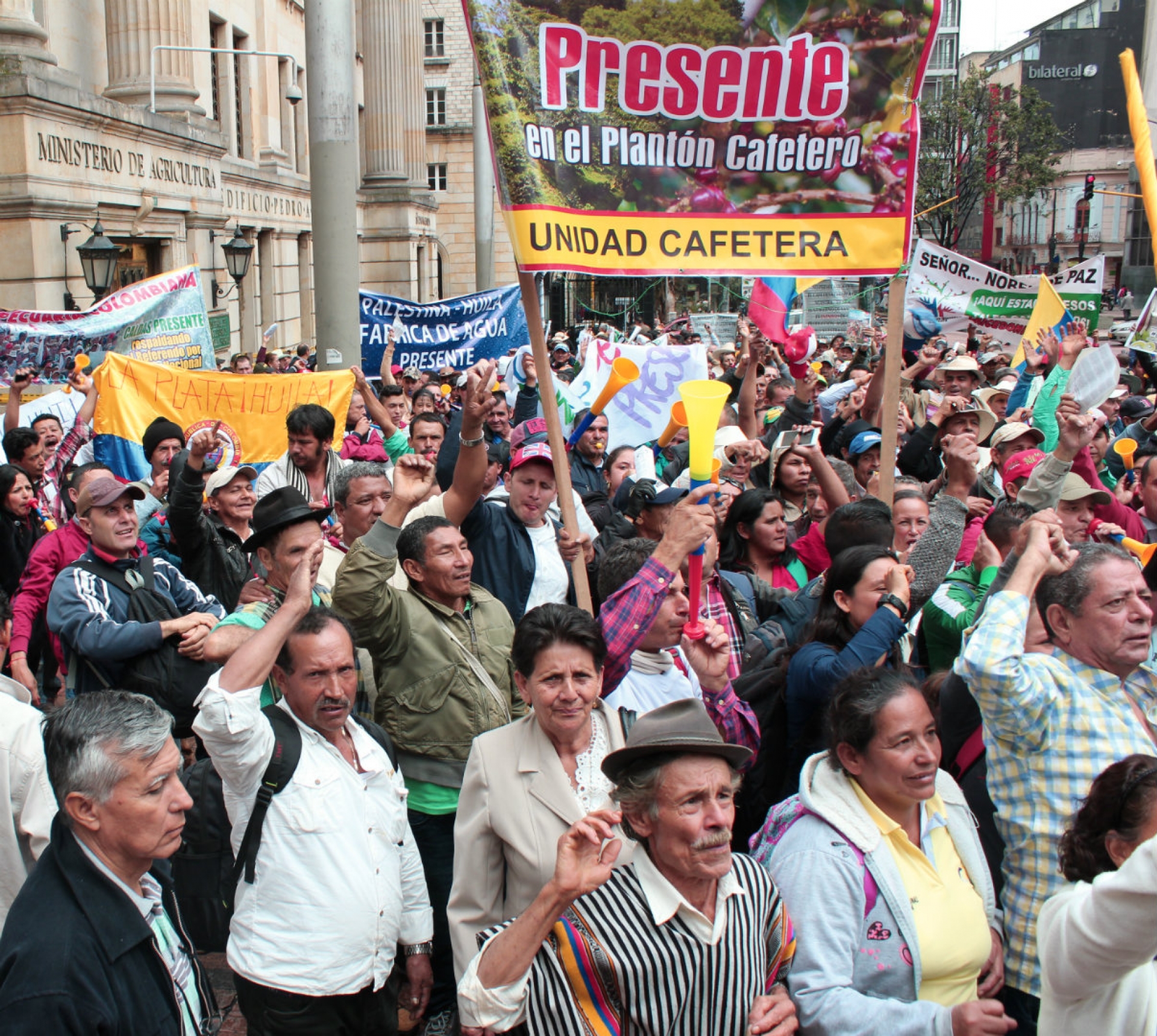 Frente a la sede del Ministerio de Agricultura, ubicada en el centro de Bogotá, docenas de manifestantes oriundos de las zonas cafeteras, vestidos con ruanas, alpargatas y sombreros, se agolparon para exigir el reconocimiento de sus derechos fundamentales y la protección para sus cultivos.
