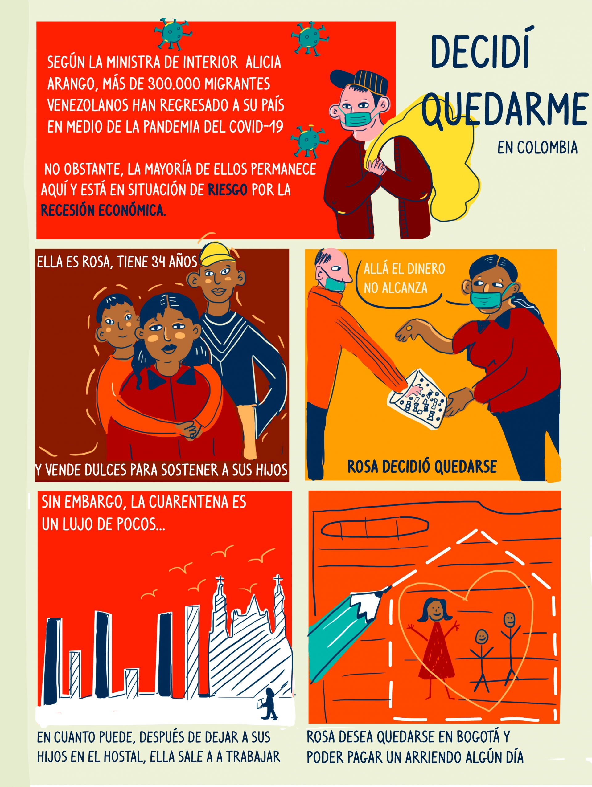 En medio de la crisis por la Covid-19 se le ha prestado menor atención a temas importantes como la situación de los inmigrantes venezolanos. Si antes era preocupante, ahora lo es más por la recesión económica. Fátima Martínez: directora de Plaza Capital, entrevistó a Rosa Castro, de 34 años, de Maracay (Venezuela) madre soltera, que nos cuenta la difícil situación que vive en este momento para lograr sostener a sus hijos: Franklin de 14 años y Yeiber de 12 años. Un ejemplo de vida de que no todos los venezolanos terminan regresando a Venezuela durante la cuarentena en Bogotá.