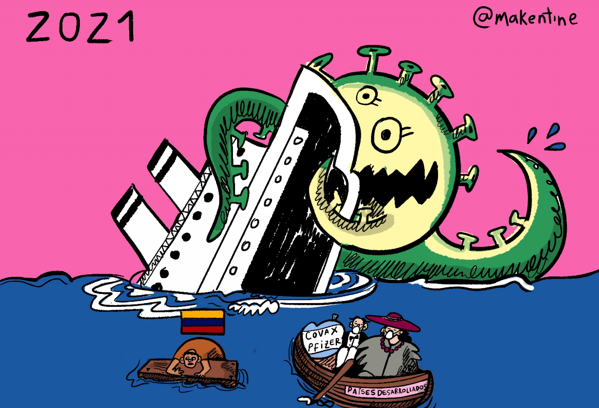 A pesar de que el presidente Iván Duque confirmo que la vacunación contra el covid-19 comenzará el 20 de febrero aún falta mucho tiempo para que las cosas vuelvan a la normalidad. Además, todavía no están aseguradas las vacunas para toda la población en el país. A continuación, una caricatura de la periodista María Camila Pulido que muestra la dura situación de los colombianos. Covidtanic… una analogía con la famosa película ganadora de 11 premios Oscar. Dentro de la crisis somos esos pasajeros que no lograron entrar en el bote de la “salvación”. Nos toca esforzamos un poco más, pero… saldremos adelante. ¡Como siempre lo hemos hecho!