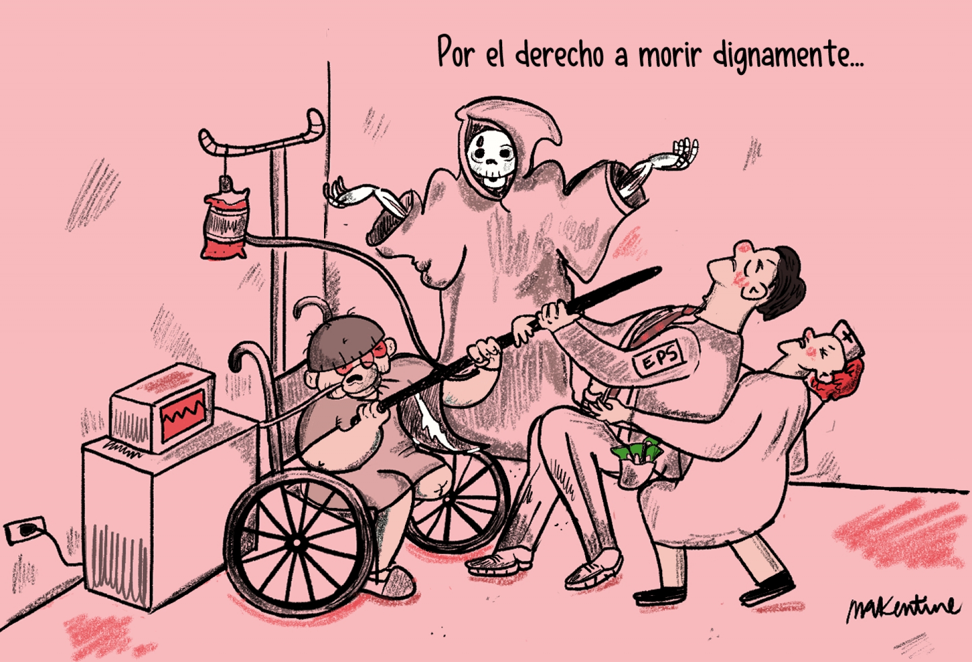Plaza Capital presenta una caricatura de opinión de la estudiante María Camila Pulido que mide esa dualidad entre la vida obligada y la muerte. Por un lado, están las EPS, aquellas que se benefician económicamente de los pacientes enfermos y terminales, por el otro está el paciente cuyo día a día es un inferno. ¿De verdad podría llamársele bajo esas circunstancias vida?