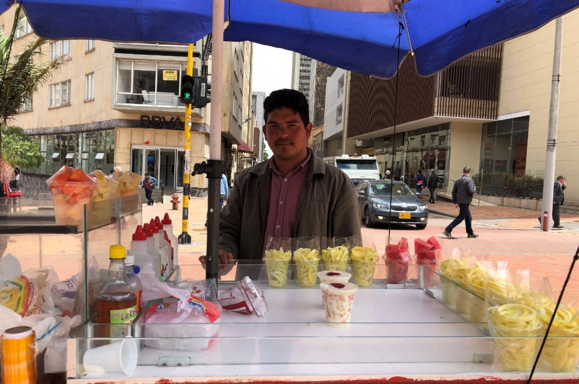 Al caminar por el emblemático Parque de los Periodistas, situado entre la cra. 3 y 4 y las calles 13 y 17, se pueden encontrar múltiples puestos de venta de todo tipo. Robert Figueroa se localiza en la esquina del Hotel Continental y se transporta cada día desde Kennedy hasta Santa Fe con su carrito cargado de frutas picadas y jugos naturales para poder mantener a su familia con las ganancias que pueda adquirir durante un día de ventas en esta esquina.