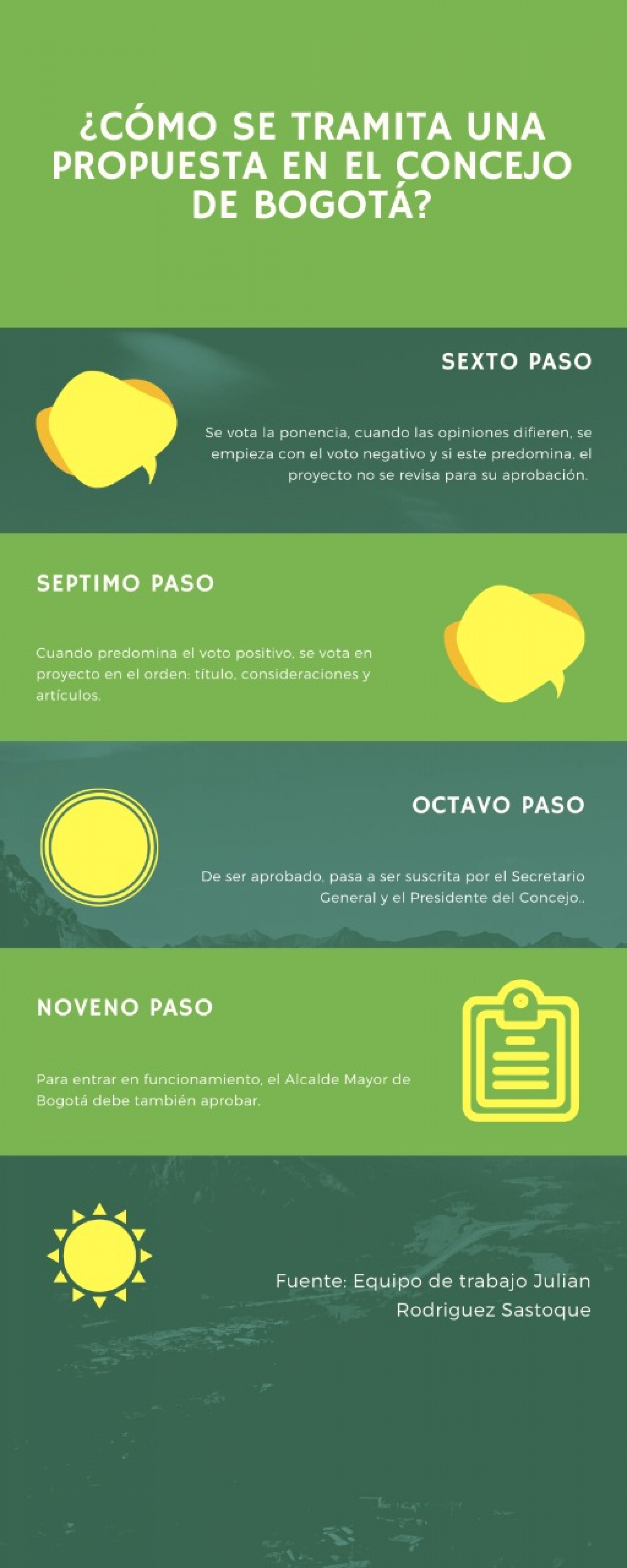 Plaza Capital dialogó con los asesores del concejal Julián Rodríguez Sastoque del Partido Alianza Verde quienes explicaron que el proceso para tramitar una propuesta en el Concejo de Bogotá consta de ocho pasos: