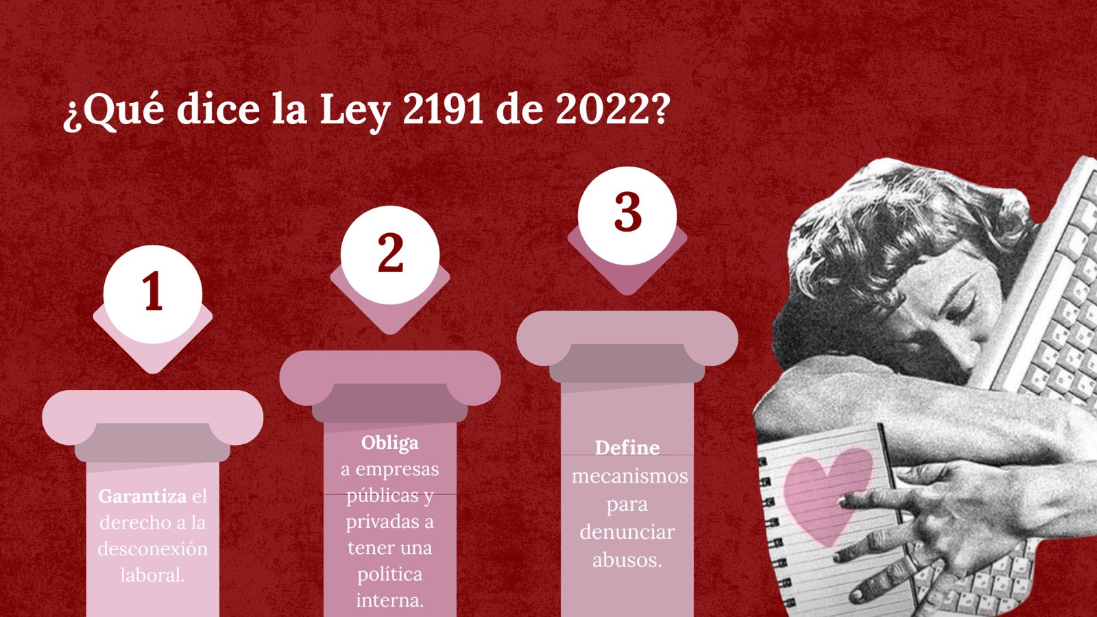“La Ley 2191 de 2022 garantiza que los trabajadores puedan desconectarse una vez cumplida su jornada laboral”, explica Paula Carreño, abogada especialista y magister en derecho laboral. La norma obliga a todas las empresas, públicas y privadas, a tener una política de desconexión laboral que defina cómo se respetan los horarios y los medios para denunciar abusos.