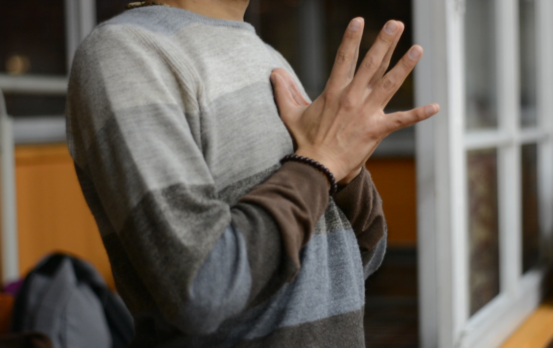 De sus labios salen cantos que demuestran su devoción a la religión, a su familia, a su Dios. Desde hace 15 años predica su religión. Tras muchos años de sufrir de depresión y sentirse ajeno a su vida, conoció a los Hare Krishna por un pariente cercano. Decidió acudir a sus cultos y hasta hoy, lo sigue haciendo, se volvió en uno de sus más fieles devotos. Recita y toca con ganas las panderetas que indican un nuevo día de Krishna. Ya son las siete de la mañana y Acintya, como maestro da una clase sobre su texto sagrado, el Bhagavad gita.