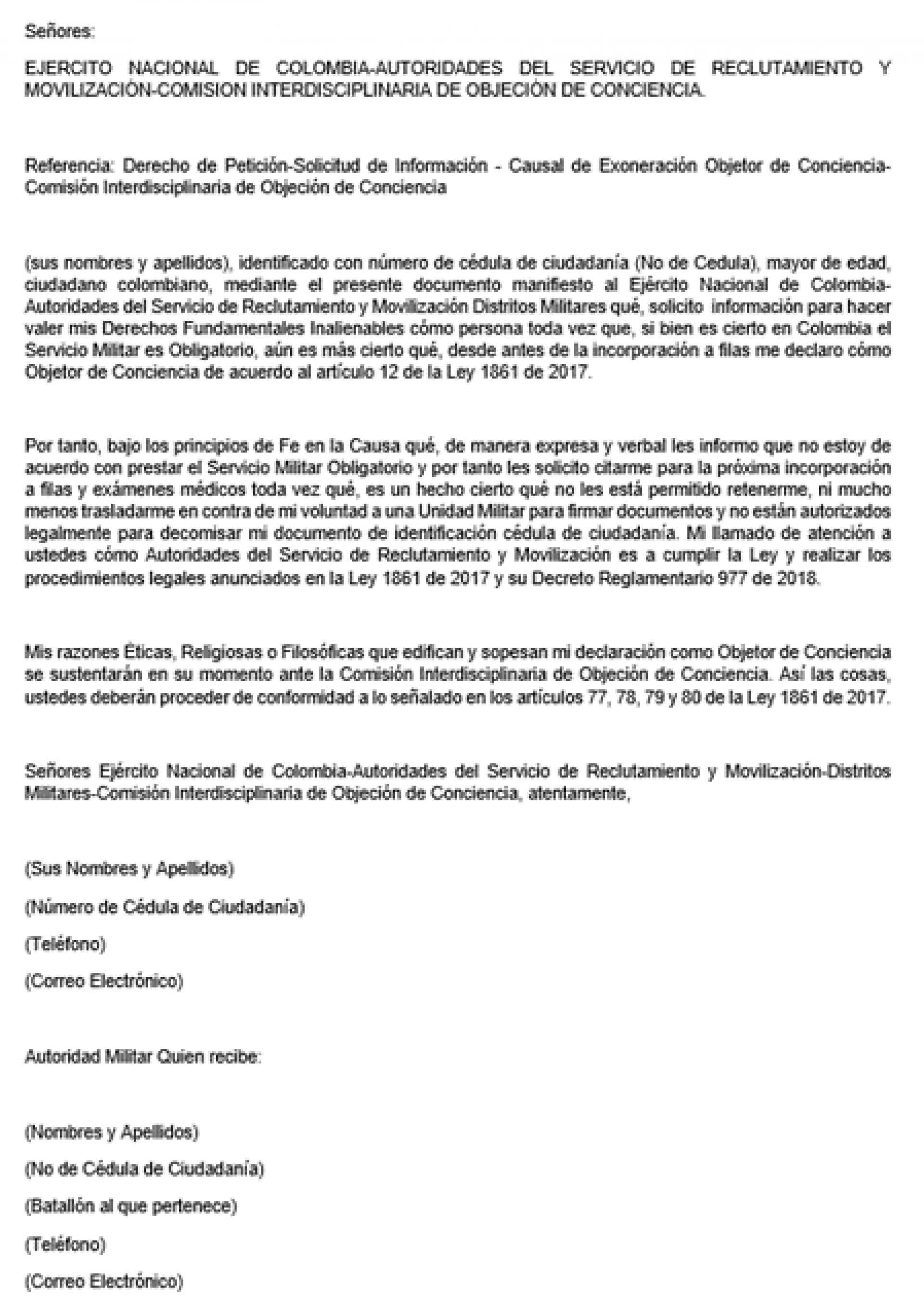 El abogado Juan Carlos Valderrama explica que antes de la incorporación a las filas del Ejército se debe acreditar alguna de las causales de exoneración ante las autoridades de reclutamiento. En el caso de la objeción de conciencia se puede hacer a través de un documento escrito en el que se argumente la oposición a prestar el servicio militar, ya sea por razones religiosas, éticas, morales, entre muchas otras.