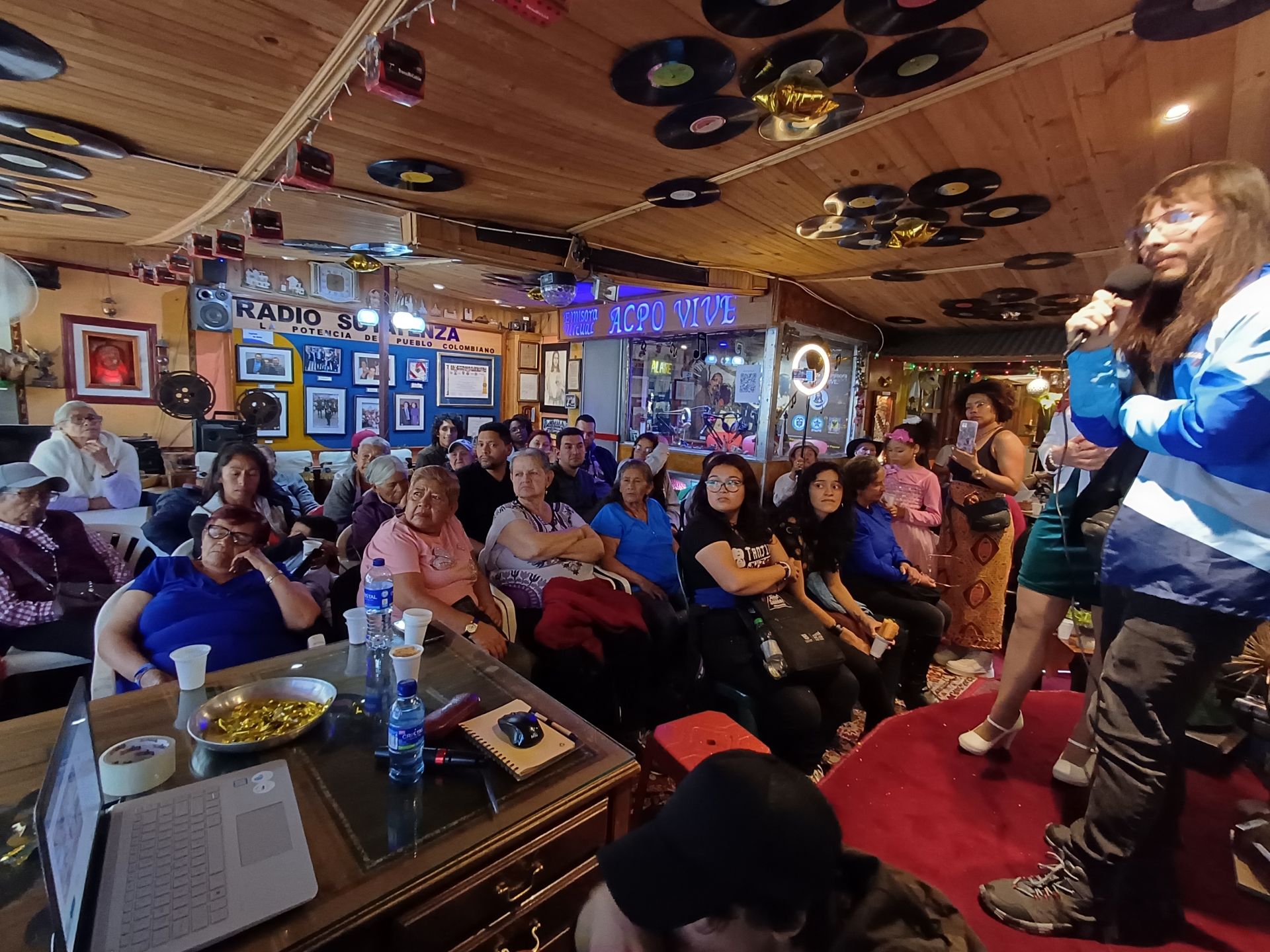 Ninguno de los invitados ha llegado aquí por casualidad, la memoria colectiva los ha traído de la mano. Ese es el caso de Paula García, quien vive en la localidad desde hace 26 años y hace parte de la emisora comunitaria “La Terraza”, un proyecto que nació en la pandemia para recuperar la memoria de la localidad por medio de la radio: “Es justo y necesario recolectar lo que pasa acá”, dice Paula cuando sube al escenario. Ella cuenta que este proyecto se formó hace cuatro años gracias al trabajo de la red de medios sonoros comunitarios de Ciudad Bolívar, “Suena a calle”, donde conoció a los integrantes de “Andariegos” y con los que hoy comparte un café en la Casa Museo Radio Sutatenza.