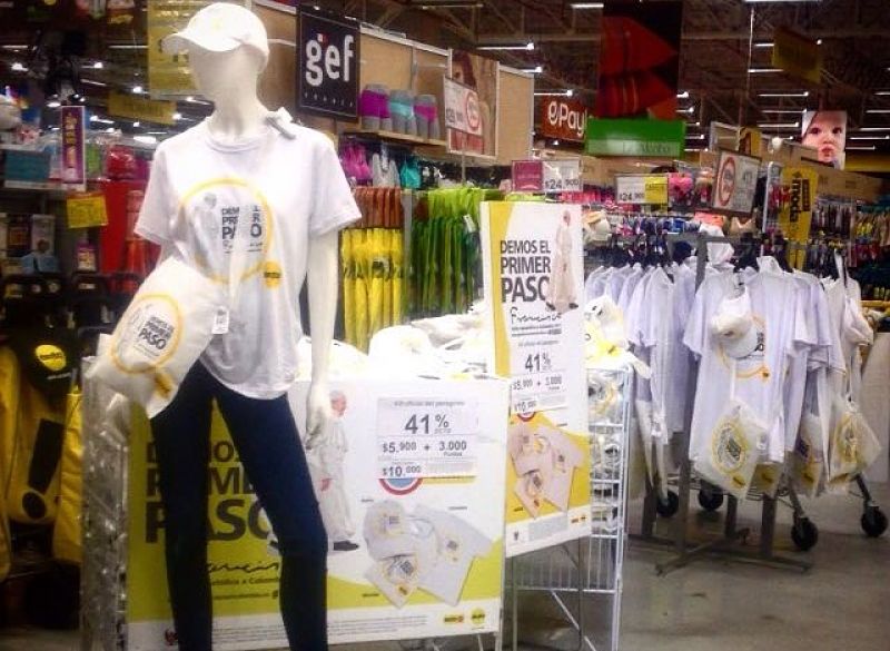 Los almacenes Éxito, junto con la Conferencia Episcopal de Colombia (CEC), prepararon un Kit Oficial para la llegada del Papa Francisco al país. Cada kit consta de una camiseta, una gorra y una tula, todos estos estampados con una imagen del Sumo Pontífice y con el lema “Demos el primer paso”, además de un folleto donde se explica su visita a nuestro país.