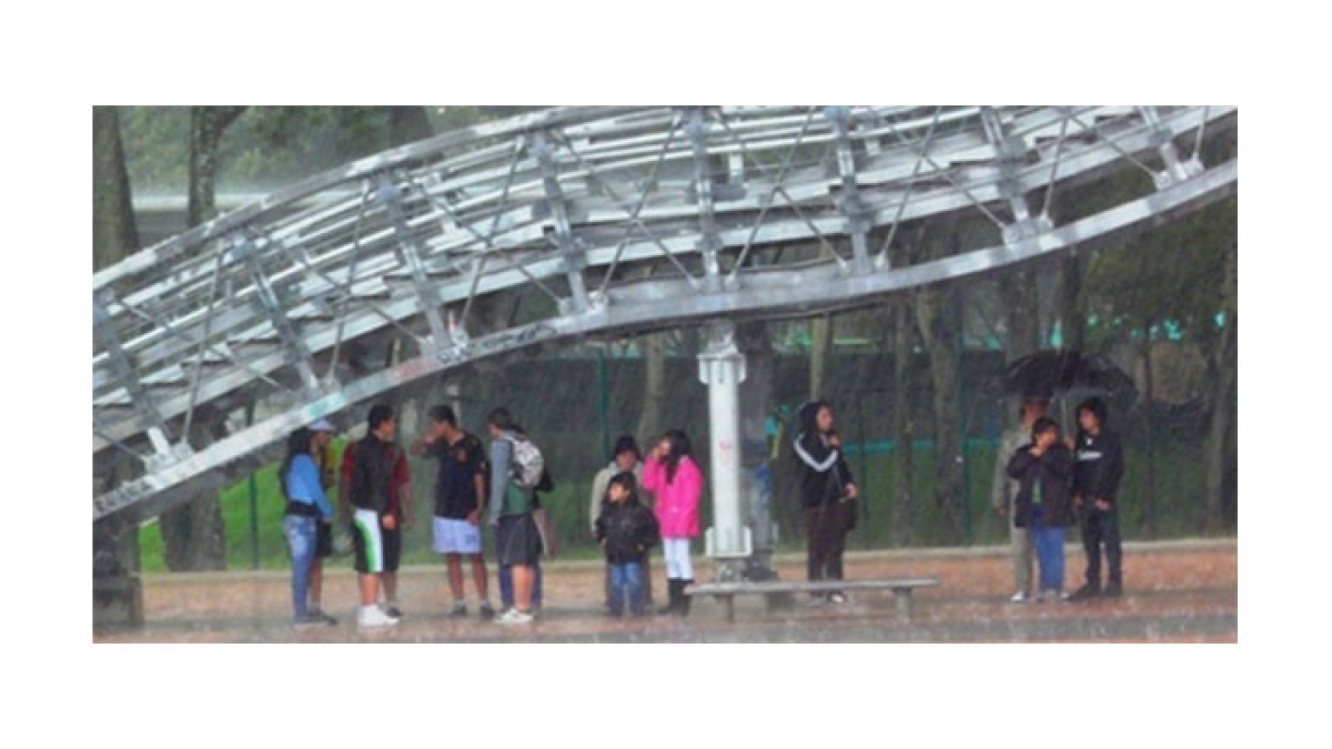 Bajo este puente peatonal, entre la calle 63 con transversal 46, se observa a jóvenes, mujeres y un niño escampando de la fuerte lluvia.
