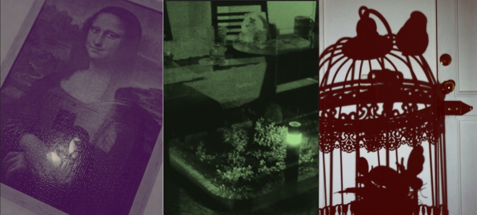 Sombras de medianoche|Regando las plantas, Calavera con sombra de rostro|Sombra árbol artificial, Cuarto de estudio, tecnología el opuesto a la naturaleza, Materas en forma de animales, La sombra de una mano queriendo abrir la puerta, buscando libertad, poder salir|En medio de la oscuridad y a pesar de una pequeña sombra peligrosa, el arte una fuente de luz, Comedor reflejado en la ventana que da al jardín de al frente, Jaula y puerta de una casa, ambas prisiones|||