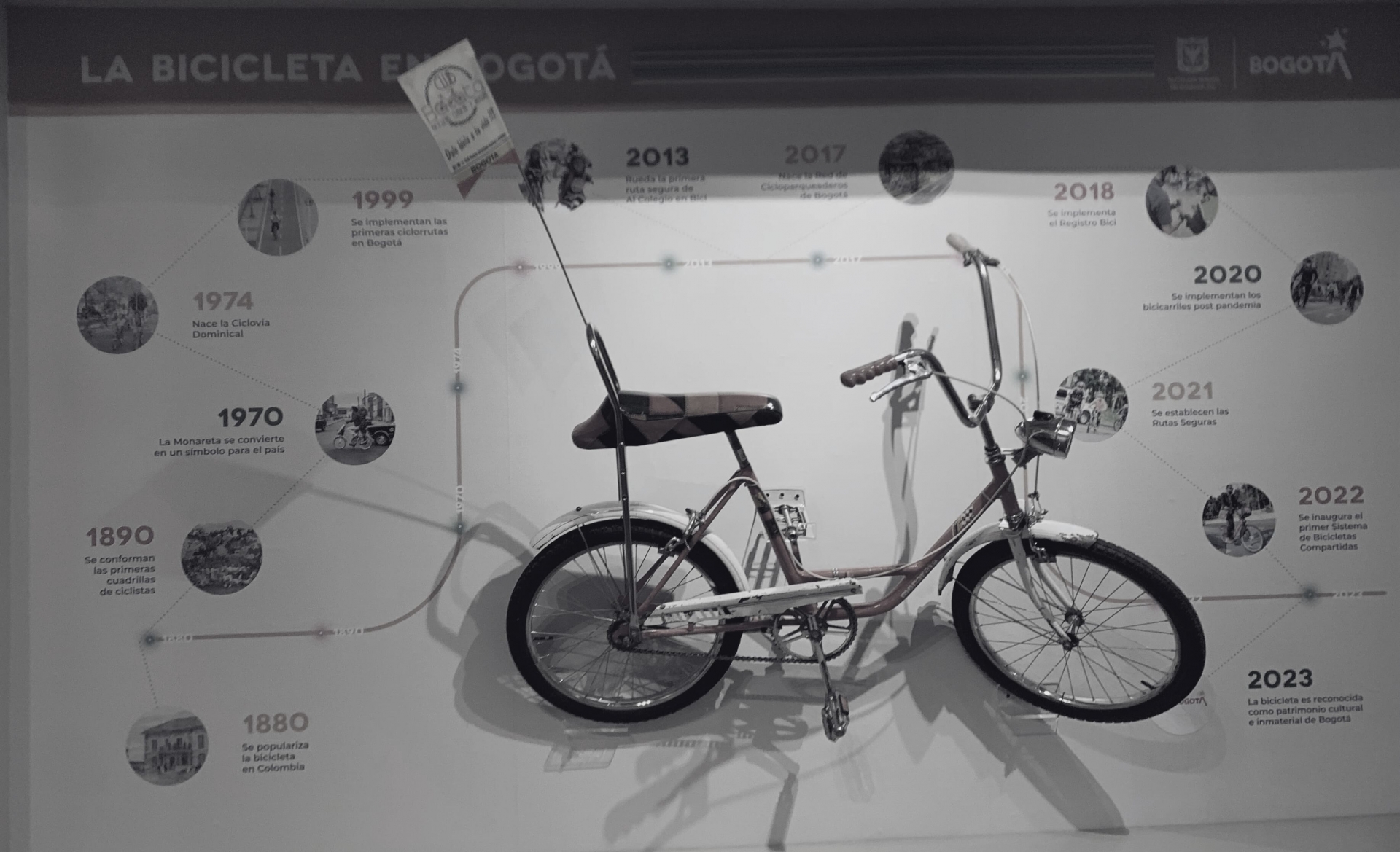 La muestra realizada por el Museo Nacional de Colombia en conjunto con la Secretaria de Movilidad y el Club Bacatá. Tiene el objetivo de dar a conocer la historia de la bicicleta en Bogotá desde 1880. En el marco de la inauguración de la XVI Semana de la Bici, la entidad exhibe La Monareta en la sala llamada “la Invitada”, ubicada al inicio del museo.