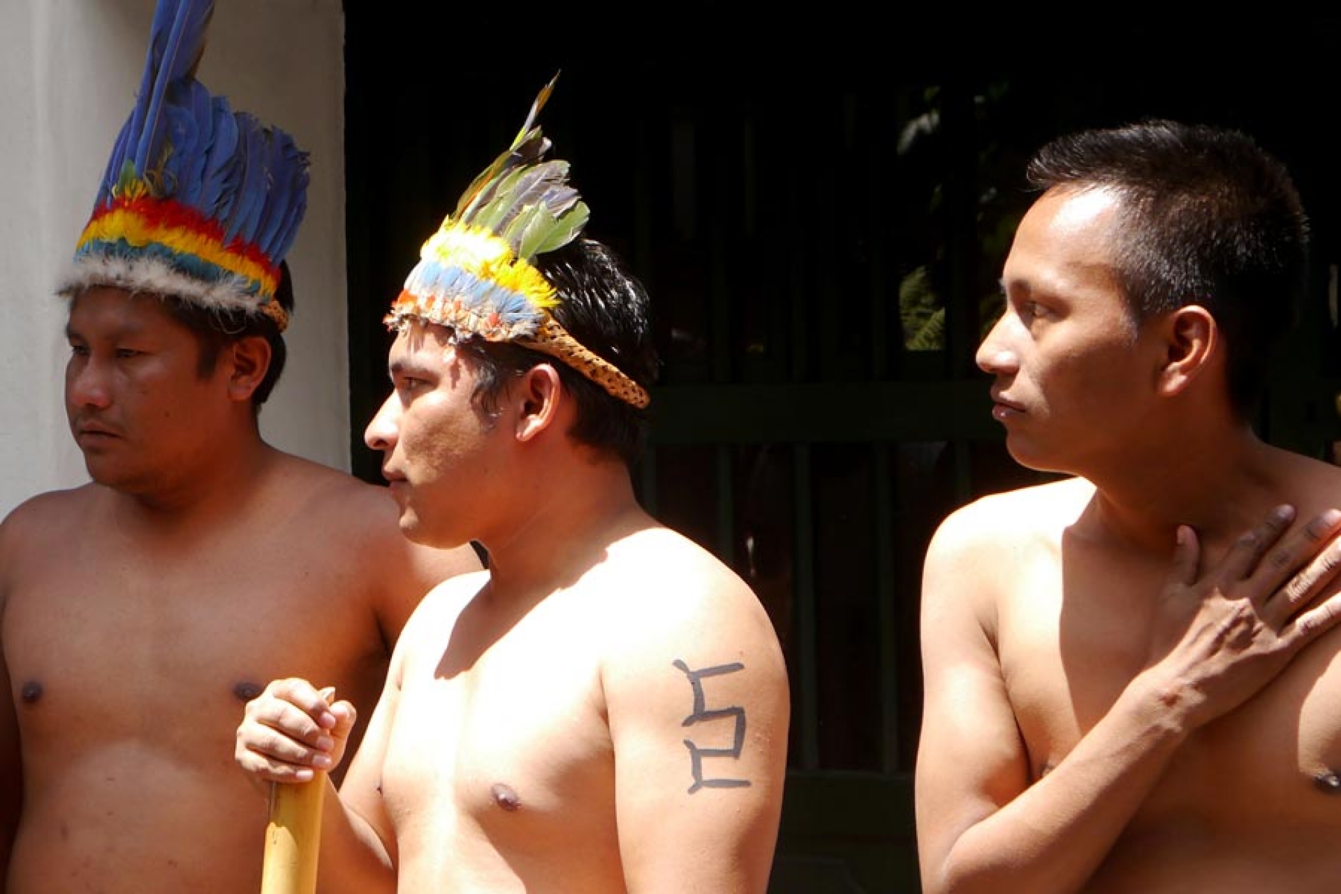 Tres hombre pertecientes al pueblo indígena Uitoto se preparan para hacer una danza ritual, en conmemoración del Día Nacional de las Lenguas Nativas.
