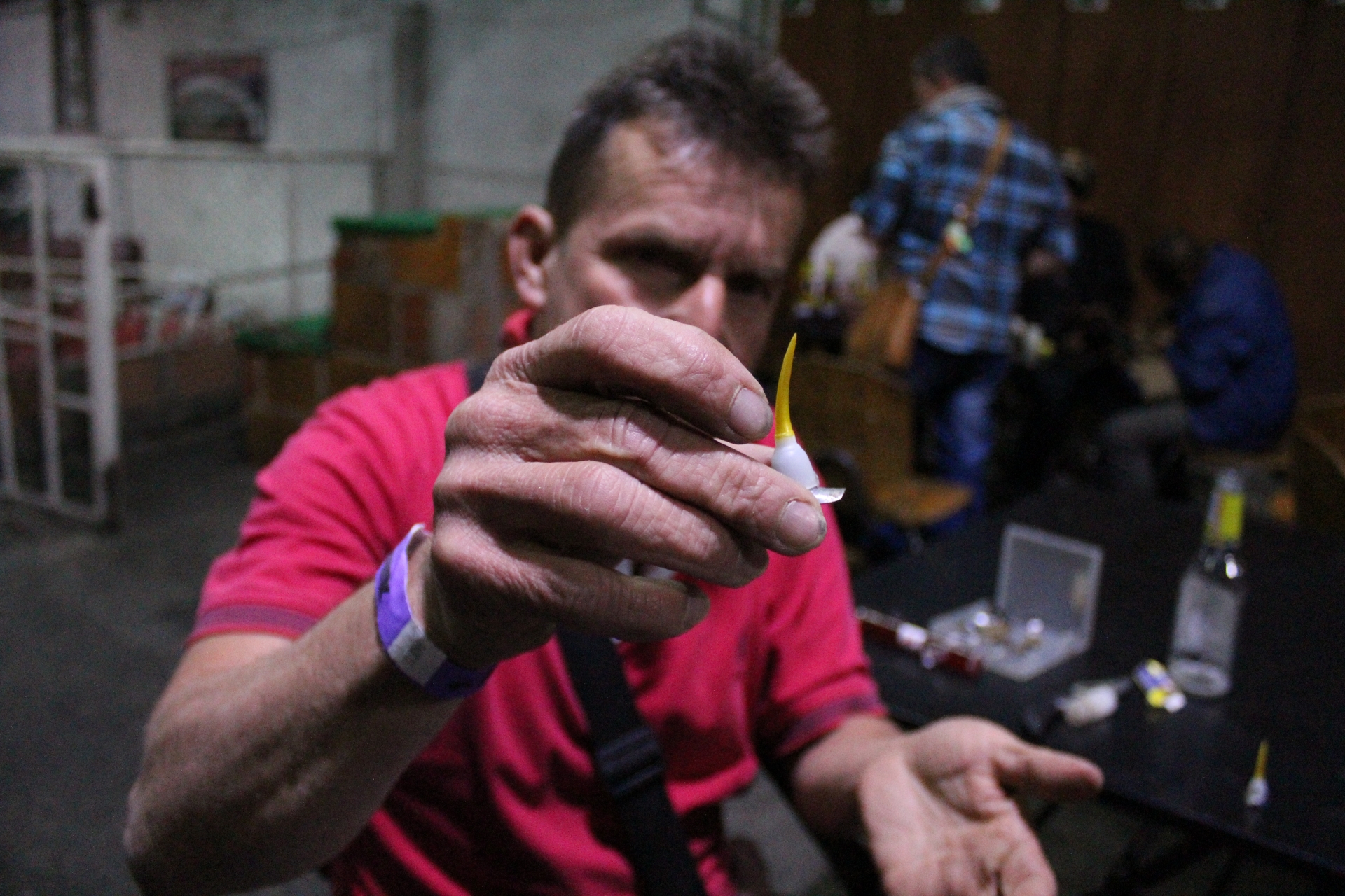 En una báscula se comienza a pesar cada uno de los gallos y así según el peso encontrar su respectivo contrincante en el ring. Los dueños de cada gallo se ubican en diferentes mesas para prepararlos para las peleas, forrando sus patas con esparadrapo para poder pegar con cera caliente las espuelas.