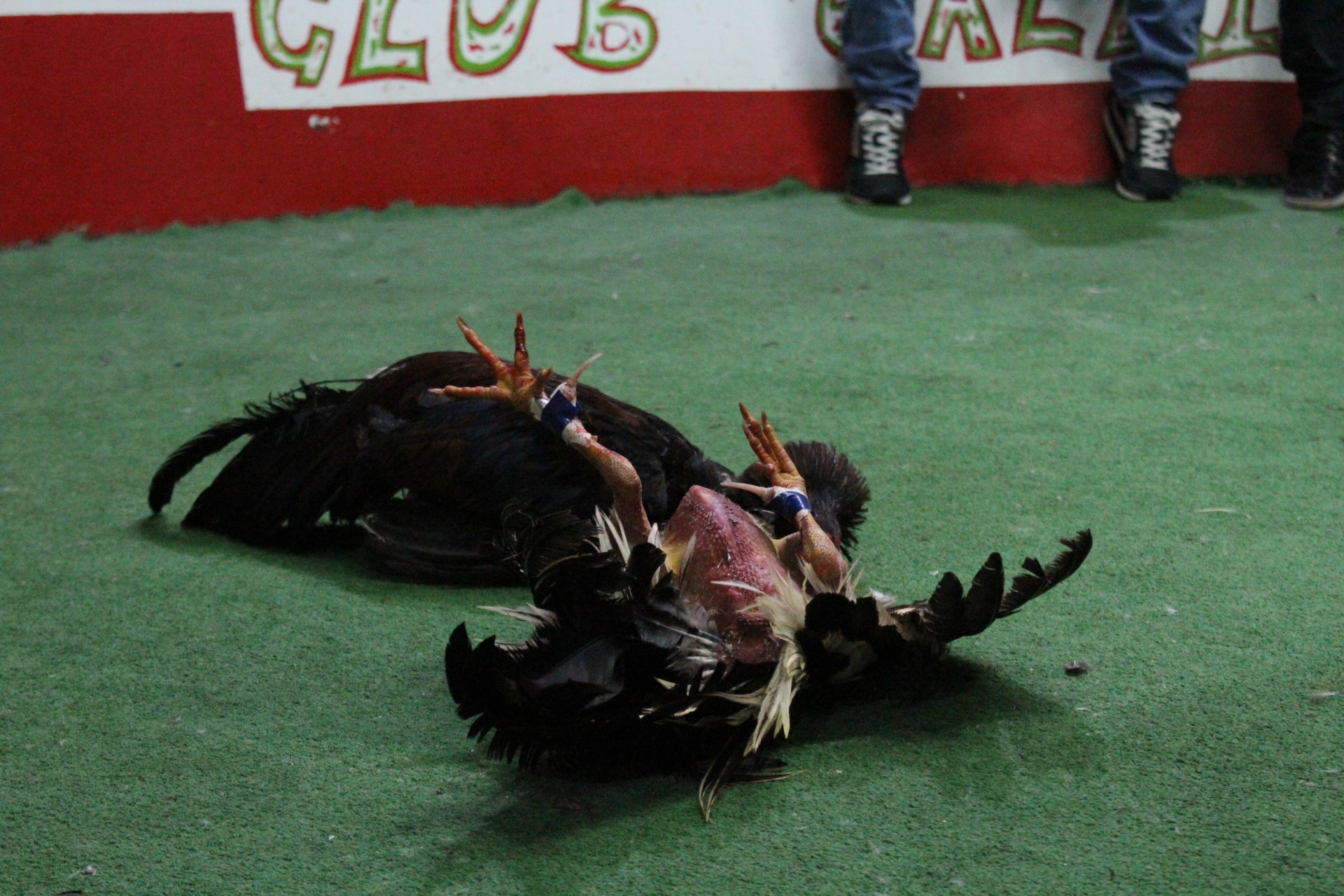 El canto imponente de los gallos retumba en cada rincón del establecimiento. Entre botellas que se chocan la una con la otra y pequeñas copas blancas repletas de aguardiente, los billetes pasan de mano en mano. Una camioneta se parquea frente a la puerta de entrada, comienzan a sacar guacal tras guacal. El reloj marca las 6 de la tarde y de esos pequeños guacales los hombres que hace instantes entraron gracias a la compra de una manilla, empiezan a sacar gallos de diferentes tamaños y plumaje, a muchos de estos gallos se les remueve la cresta y las barbas para no ser agarrados de ahí por su adversario.