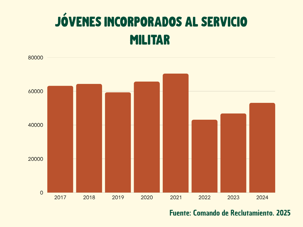 El Ejército Nacional debe cubrir anualmente con cuotas de incorporación que van en aumento. Para el 2024 la cuota fue de 59.928 jóvenes y para el 2025 está en 60.000 hombres, según el Comando de Reclutamiento.