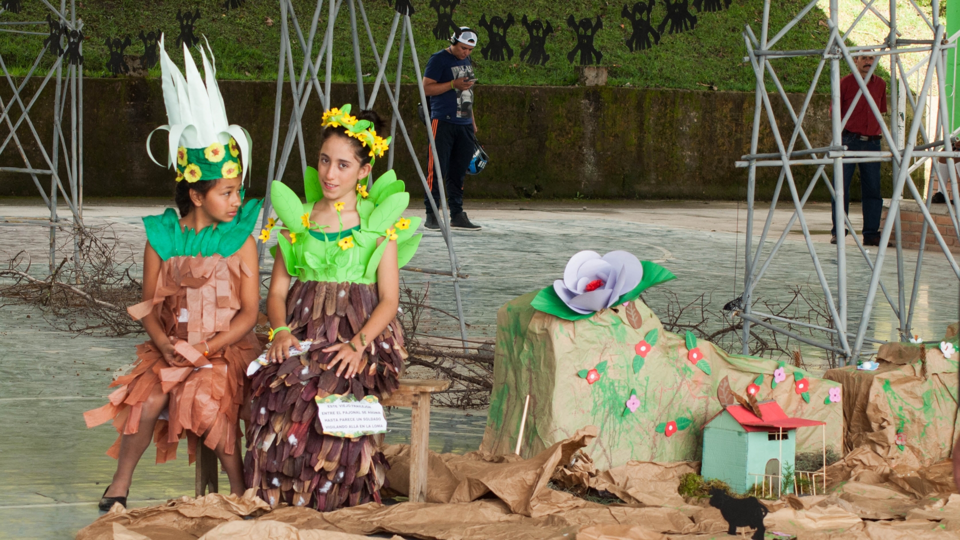 Una instalación en el centro del recinto mostró, simbólicamente, el interés de los pobladores por preservar los recursos naturales: sobre un pueblo árido (elaborado con materiales reciclables) pasaban unas torres de energía construidas con tallos de árboles, en cuyos cables colgaban calaveras. A la escena se sumaron dos jóvenes vestidas de indígenas, que eran perseguidas por un hombre disfrazado con una máscara que representa a la muerte.