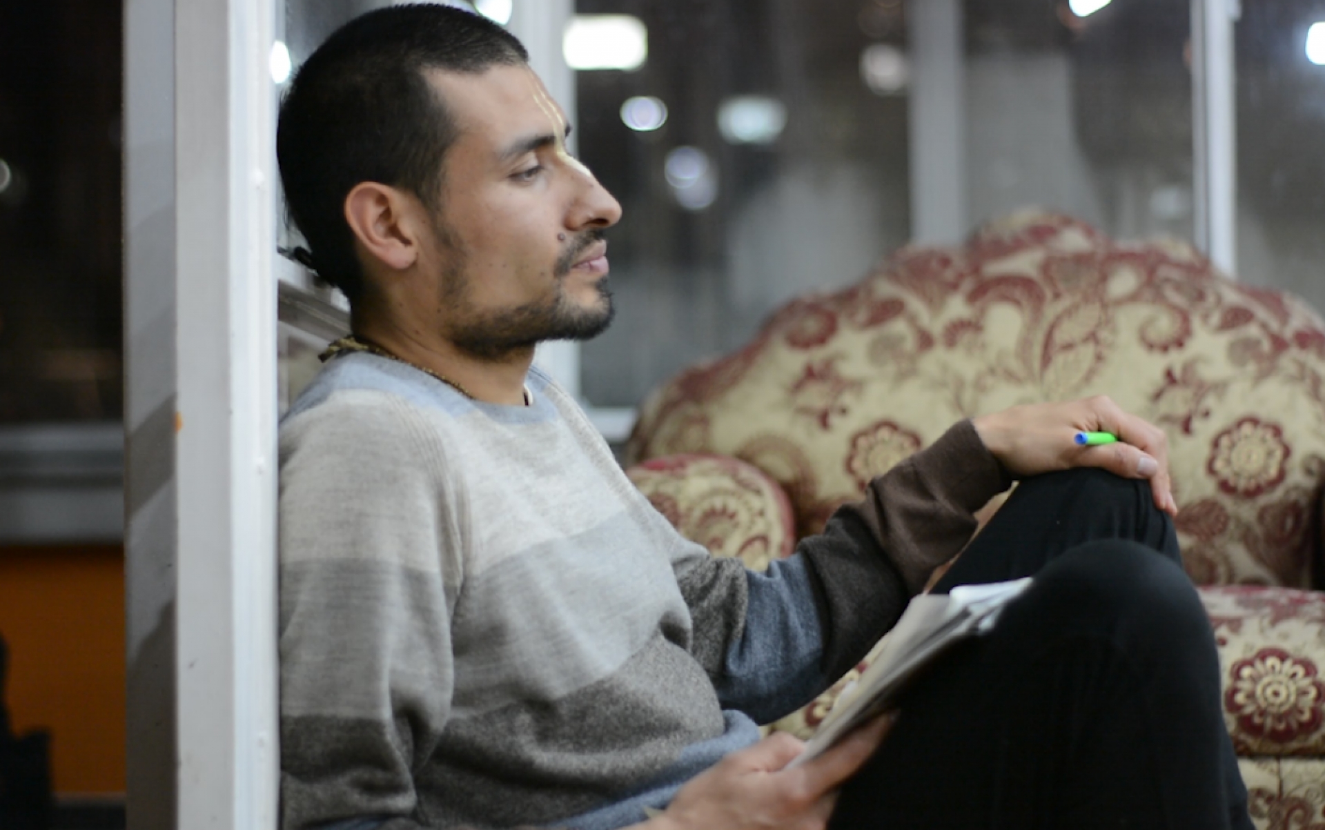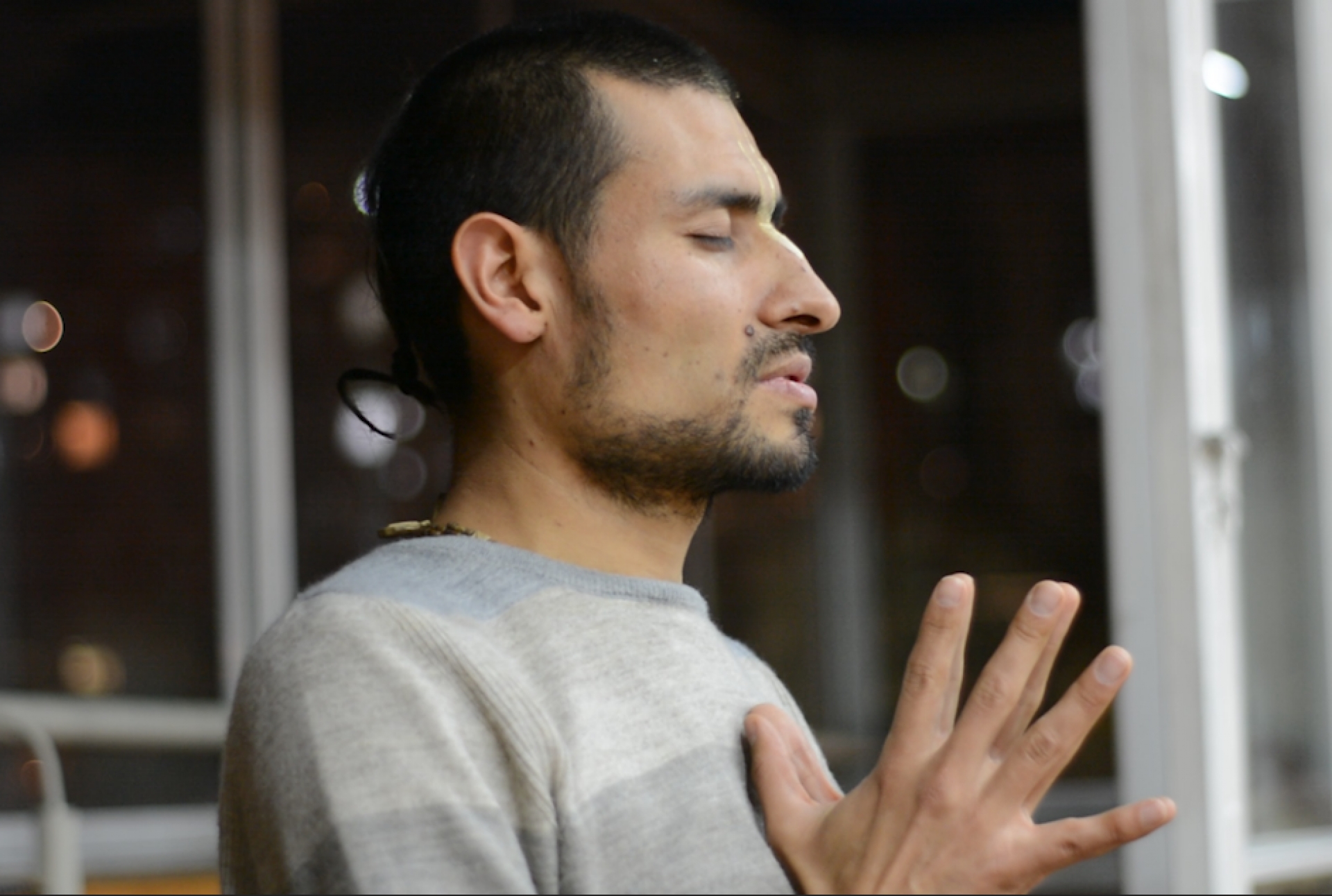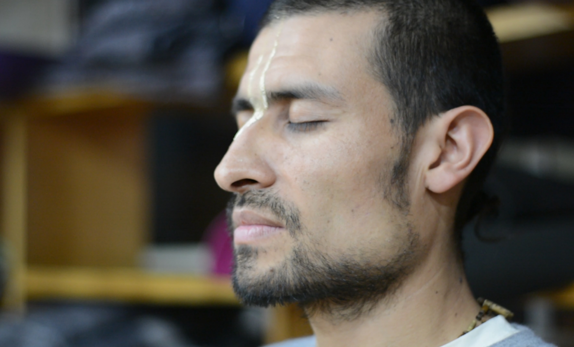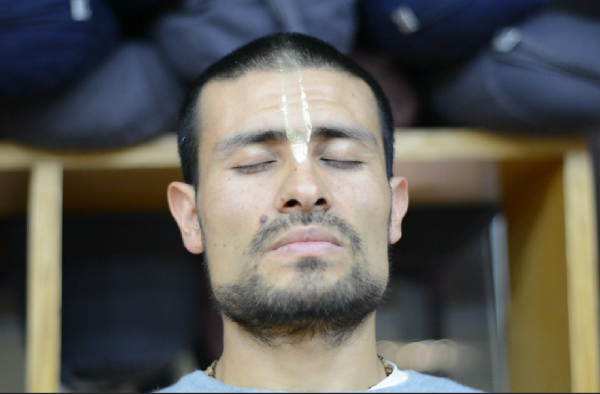 De sus labios salen cantos que demuestran su devoción a la religión, a su familia, a su Dios. Desde hace 15 años predica su religión. Tras muchos años de sufrir de depresión y sentirse ajeno a su vida, conoció a los Hare Krishna por un pariente cercano. Decidió acudir a sus cultos y hasta hoy, lo sigue haciendo, se volvió en uno de sus más fieles devotos. Recita y toca con ganas las panderetas que indican un nuevo día de Krishna. Ya son las siete de la mañana y Acintya, como maestro da una clase sobre su texto sagrado, el Bhagavad gita.