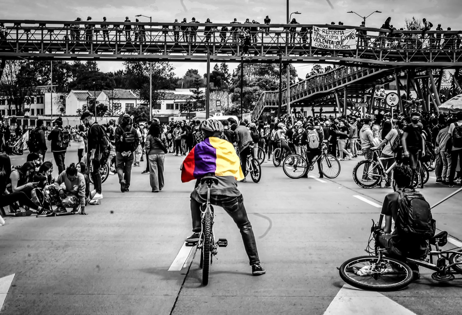 La entrada de la calle 26 de la Universidad Nacional de Bogotá era el punto de encuentro principal para estudiantes de universidades públicas y privadas. La concentración comenzó a las 9 de la mañana con demostraciones artísticas, canciones y mensajes en desacuerdo con la Reforma Tributaria y el gobierno en general. Se esperó durante dos horas, con la intención de que participaran la mayor cantidad de estudiantes posible. Durante la espera, el Transmilenio por la calle 26 ya no estaba disponible, además, alrededor de 20 uniformados del ESMAD estuvieron presentes en la concentración. Lo que más llamó la atención de la espera fueron los jóvenes que hicieron ‘slackline’, pasando encima de una cuerda muy delgada, amarrada en el puente, demostrando valentía y fuerza.