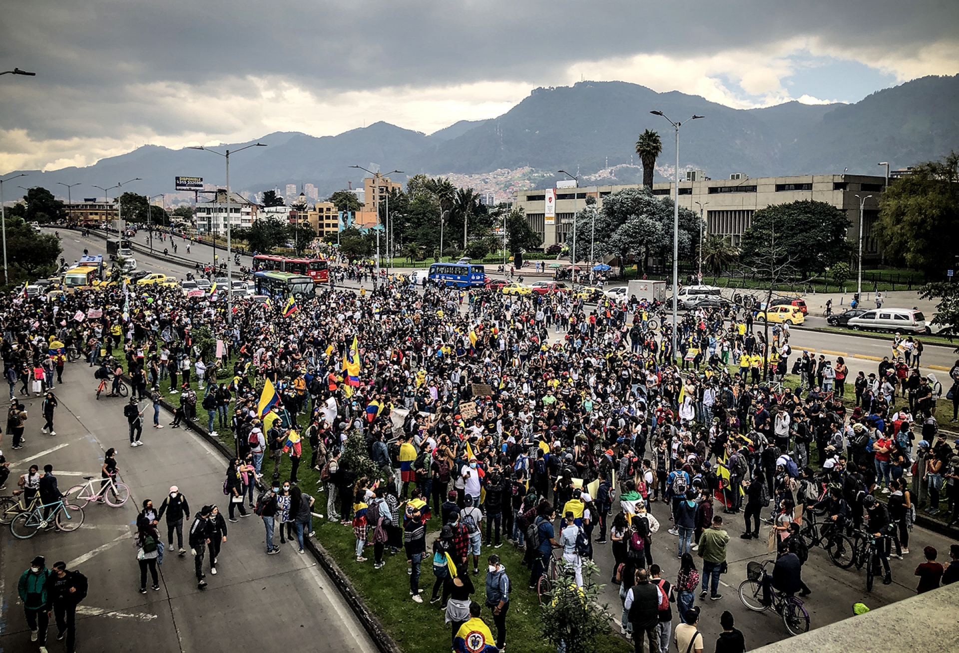A la 1 de la tarde comenzó una fuerte lluvia en Bogotá, por esto, la marcha se vio obligada a tomar una pausa. Los estudiantes se ubicaron bajo el puente de la carrera 30 con calle 13. La energía, a pesar del clima y el día oscuro, continuó cesante. Debajo del puente se incendiaron algunas llantas de automóvil, como símbolo de lucha y resistencia. Después de unos 30 minutos, cuando la lluvia bajo un poco, la marcha continuó por la calle 13, para luego tomar las Américas y finalmente llegar a Banderas.