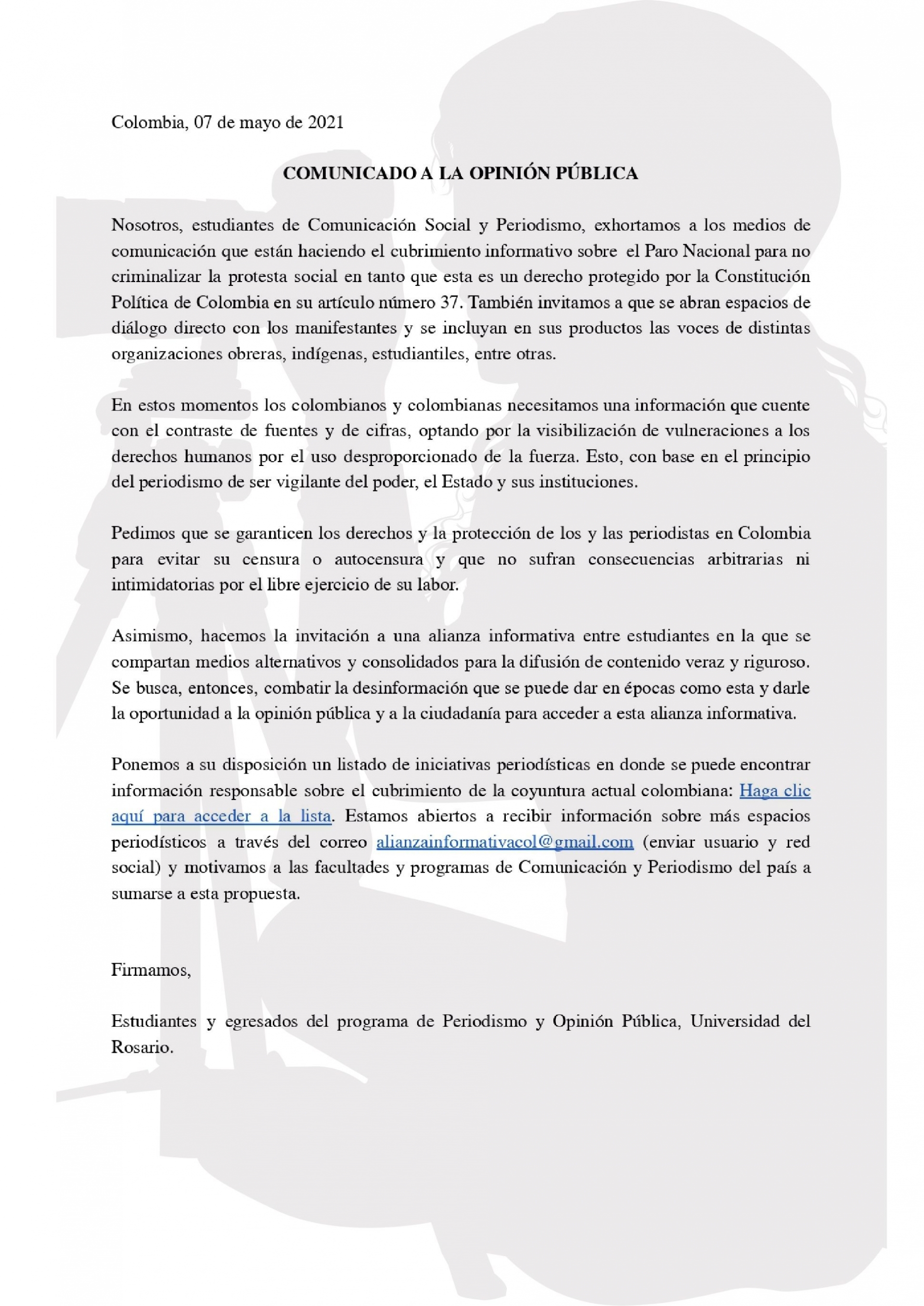 En estos momentos los colombianos y colombianas necesitamos una información que cuente con el contraste de fuentes y de cifras, optando por la visibilización de vulneraciones a los derechos humanos por el uso desproporcionado de la fuerza. Esto, con base en el principio del periodismo de ser vigilante del poder, el Estado y sus instituciones. Pedimos que se garanticen los derechos y la protección de los y las periodistas en Colombia para evitar su censura o autocensura y que no sufran consecuencias arbitrarias ni intimidatorias por el libre ejercicio de su labor. Asimismo, hacemos la invitación a una alianza informativa entre estudiantes en la que se compartan medios alternativos y consolidados para la difusión de contenido veraz y riguroso. Se busca, entonces, combatir la desinformación que se puede dar en épocas como esta y darle la oportunidad a la opinión pública y a la ciudadanía para acceder a esta alianza informativa.