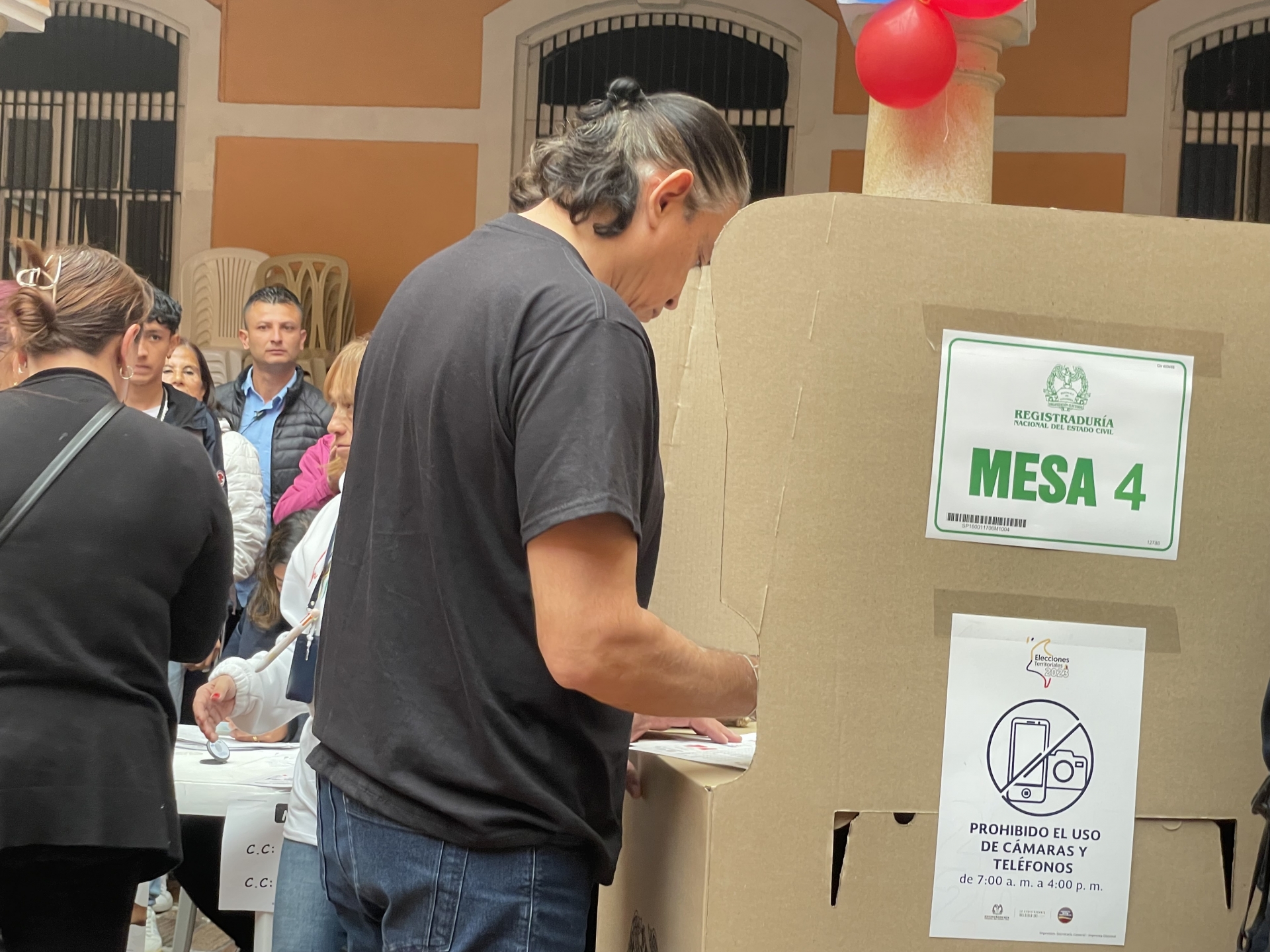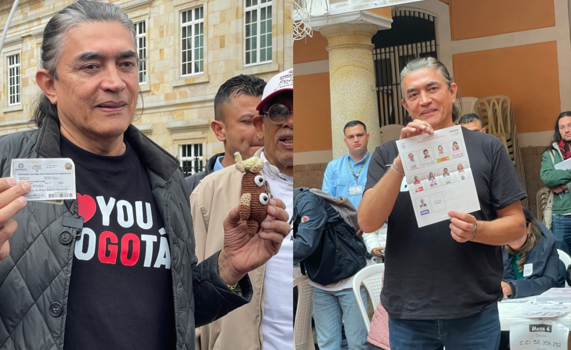 El candidato a la alcaldía del Pacto Histórico finalmente ejerció su derecho al voto alrededor de las 9 de la mañana, acompañado por una pequeña figura del frailejón, Ernesto Pérez, y luciendo una camisa con la frase “I love you Bogotá”.