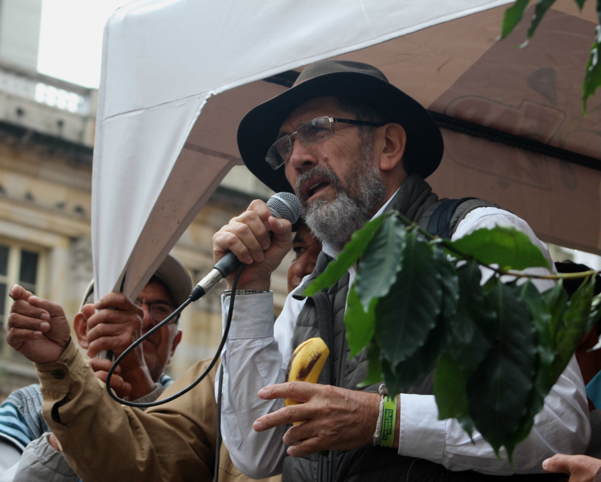 Frente a la sede del Ministerio de Agricultura, ubicada en el centro de Bogotá, docenas de manifestantes oriundos de las zonas cafeteras, vestidos con ruanas, alpargatas y sombreros, se agolparon para exigir el reconocimiento de sus derechos fundamentales y la protección para sus cultivos.