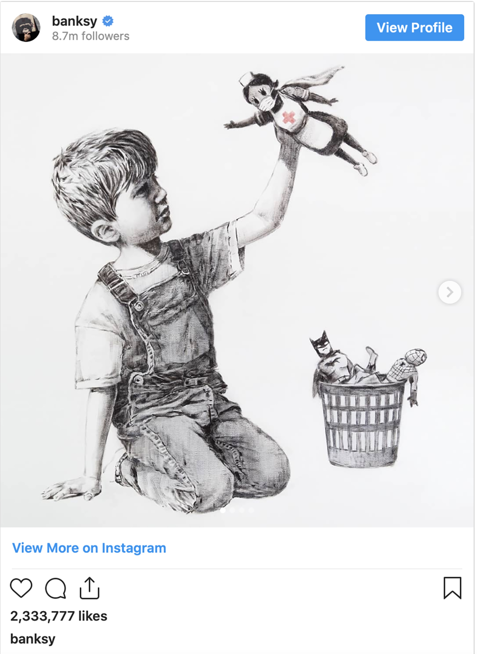 ¿Quién nos lo hubiera dicho al finalizar el 2019 que viviríamos esta pandemia durante todo el primer semestre del año 2020? El artista británico de Bristol, nuestro querido Bansky no se ha hecho esperar para crear y hacernos pensar. ¿Acaso el arte no está para eso? Ahora nos toca replantearnos quiénes son nuestros auténticos súper héroes en la sociedad, que este año, sin duda, han sido todos las personas que se dedican directa o indirectamente al ámbito sanitario, que trabajan en hospitales, centros de cuidados intensivos, urgencias y centros de personas mayores, donde se cuida con mimo a las personas de la tercera edad.
