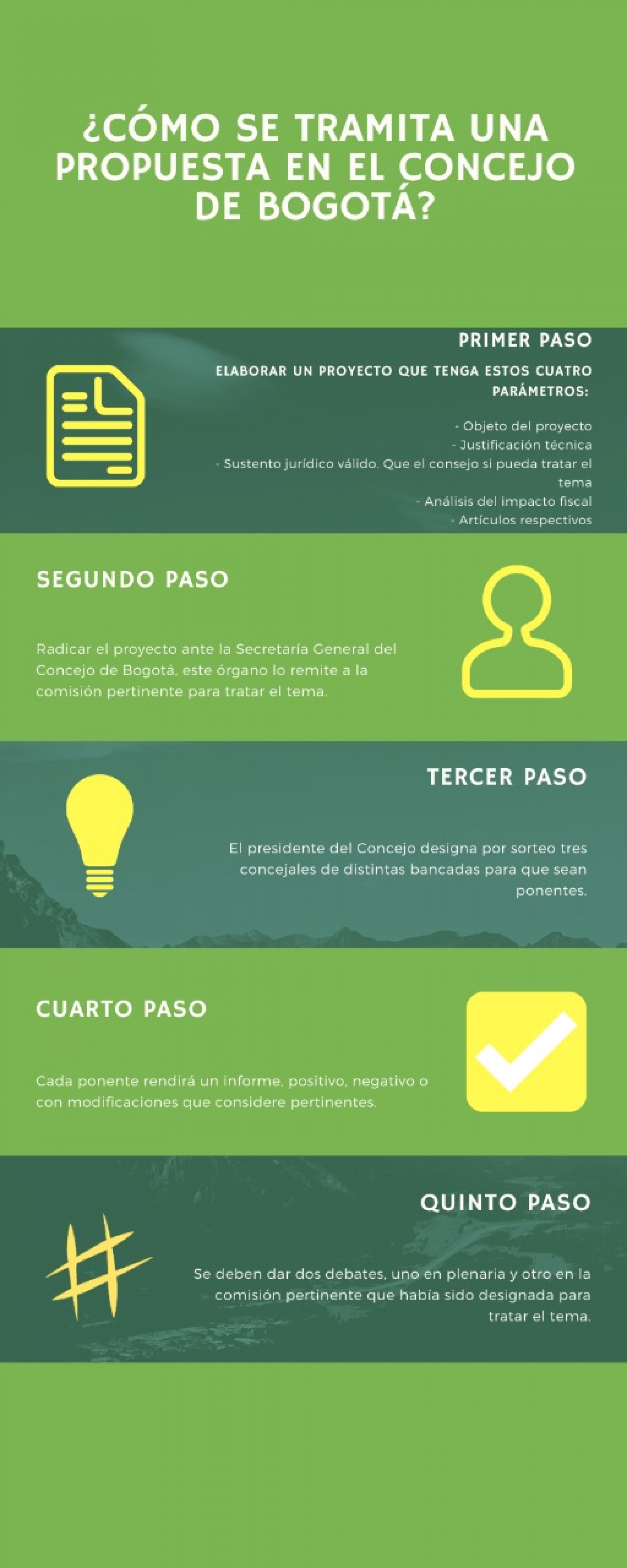 Plaza Capital dialogó con los asesores del concejal Julián Rodríguez Sastoque del Partido Alianza Verde quienes explicaron que el proceso para tramitar una propuesta en el Concejo de Bogotá consta de ocho pasos: