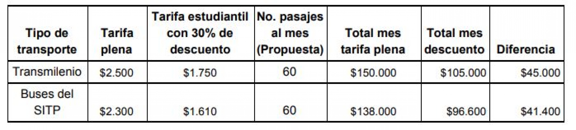 Por ejemplo, con este acuerdo, el ahorro en TransMilenio sería de 750 pesos y en el caso del SITP sería de 690 pesos por pasaje. “Mensualmente los estudiantes se ahorrarían, suponiendo 60 pasajes mensuales, entre 41 mil y 45 mil pesos lo que les beneficiaría para comprar fotocopias, almuerzo, libros, entre otros”, aseguró el concejal.