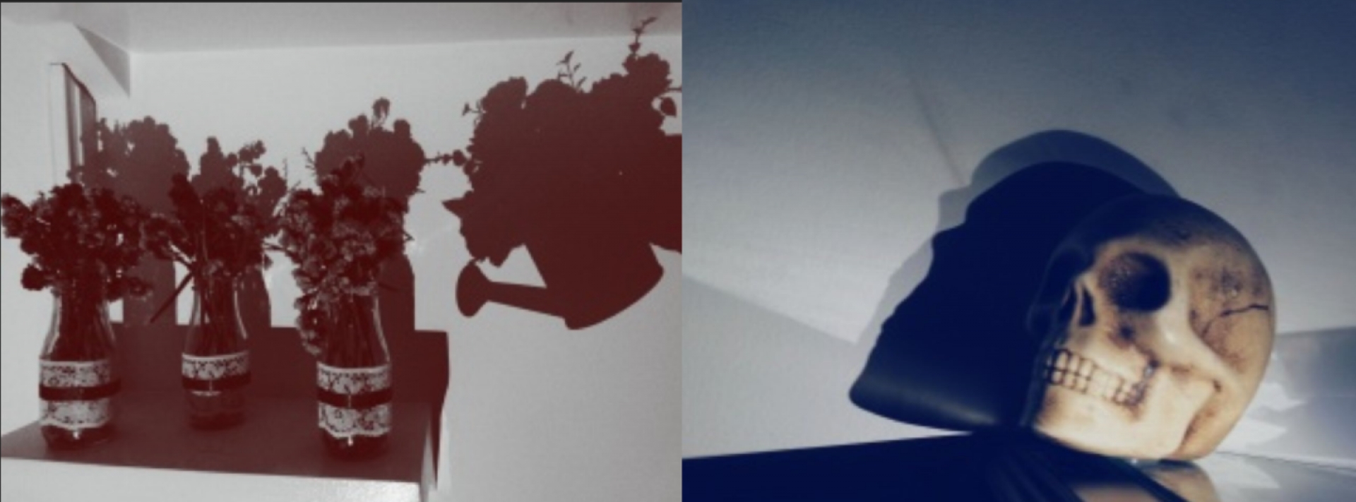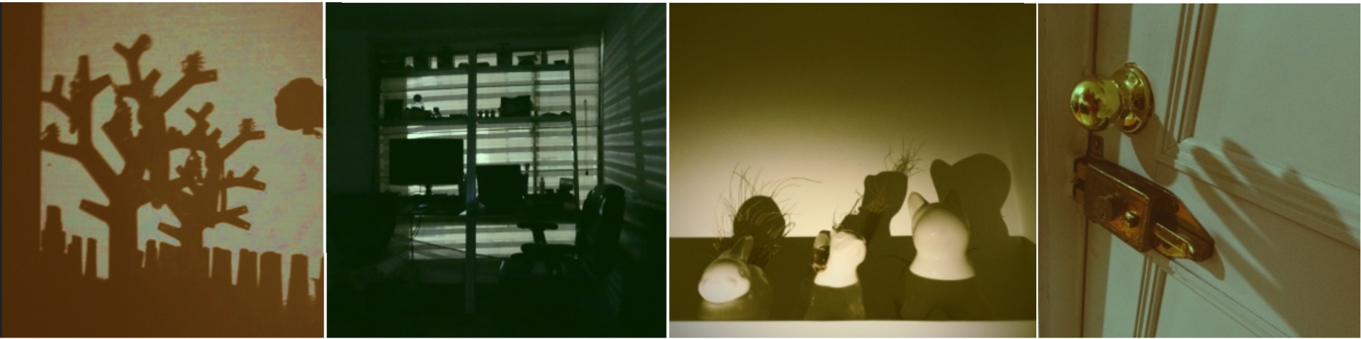 Sombras de medianoche|Regando las plantas, Calavera con sombra de rostro|Sombra árbol artificial, Cuarto de estudio, tecnología el opuesto a la naturaleza, Materas en forma de animales, La sombra de una mano queriendo abrir la puerta, buscando libertad, poder salir|En medio de la oscuridad y a pesar de una pequeña sombra peligrosa, el arte una fuente de luz, Comedor reflejado en la ventana que da al jardín de al frente, Jaula y puerta de una casa, ambas prisiones|||