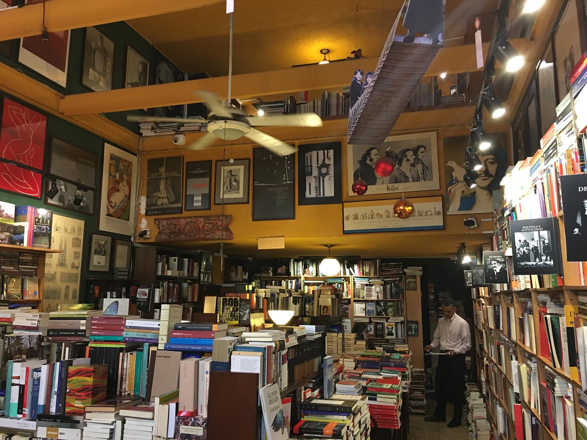 Un ventilador de techo reposa en el centro de la librería, tal vez, para refrescar las confusiones que tiene el lector al enfrentarse a tantos libros. Las paredes recorren sin pretensiones los iconos artísticos de varios siglos, el espectro es amplio, desde Mondrian hasta los Beatles. Hay centenares de libros, en estanterías que se erigen del piso al techo, en pilas en las mesas y en pequeñas vitrinas.