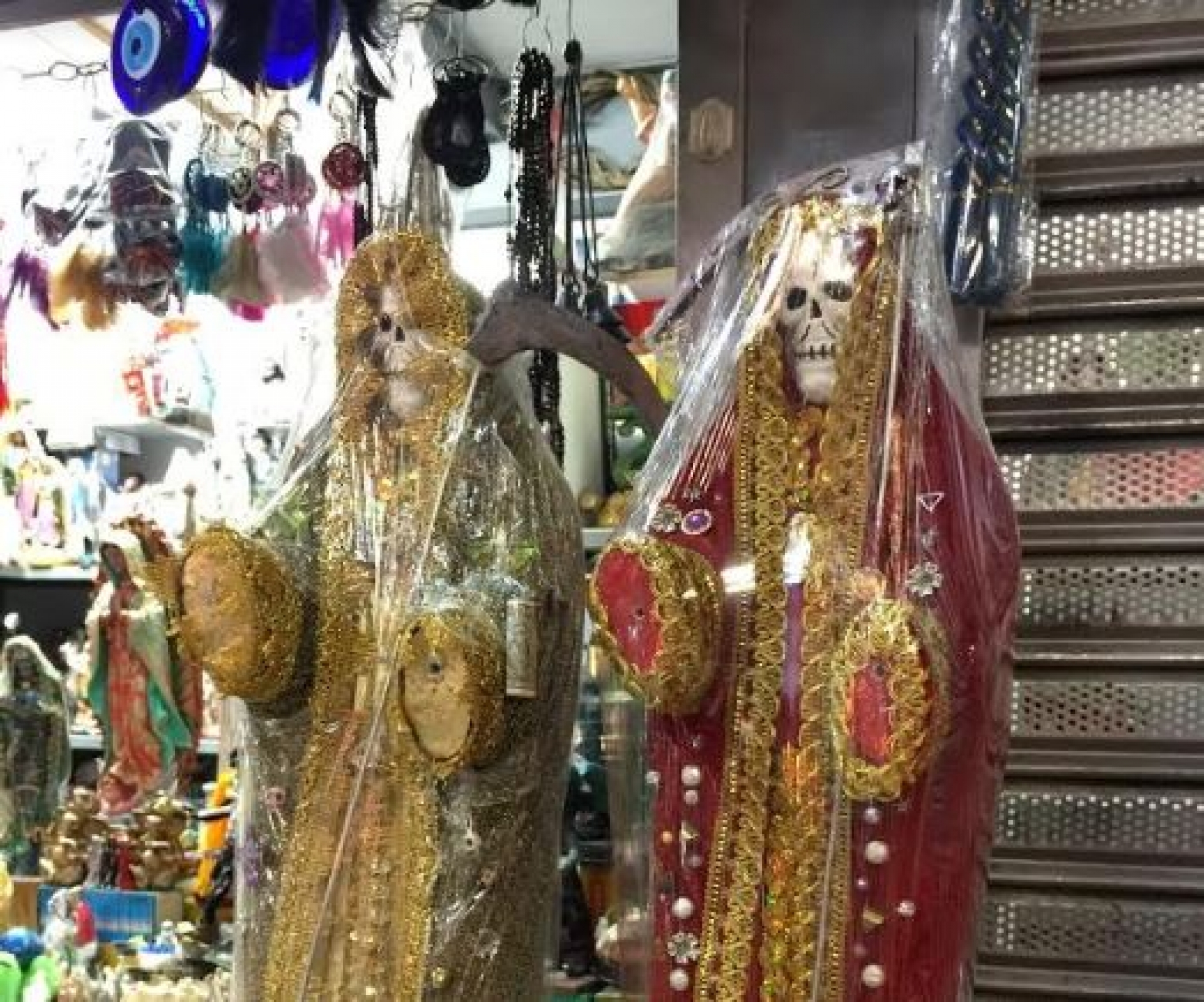 Me acerqué a una de ellas que se destacaba por tener en su mostrador dos estatuillas de lo que parecía ser una virgen con una cara de calavera y una hoz, pero que en realidad era la Santa Muerte, una figura tradicionalmente mexicana y a la que algunos veneran para hacerle peticiones de todo tipo, desde amorosas hasta las que tienen que ver con la prosperidad.