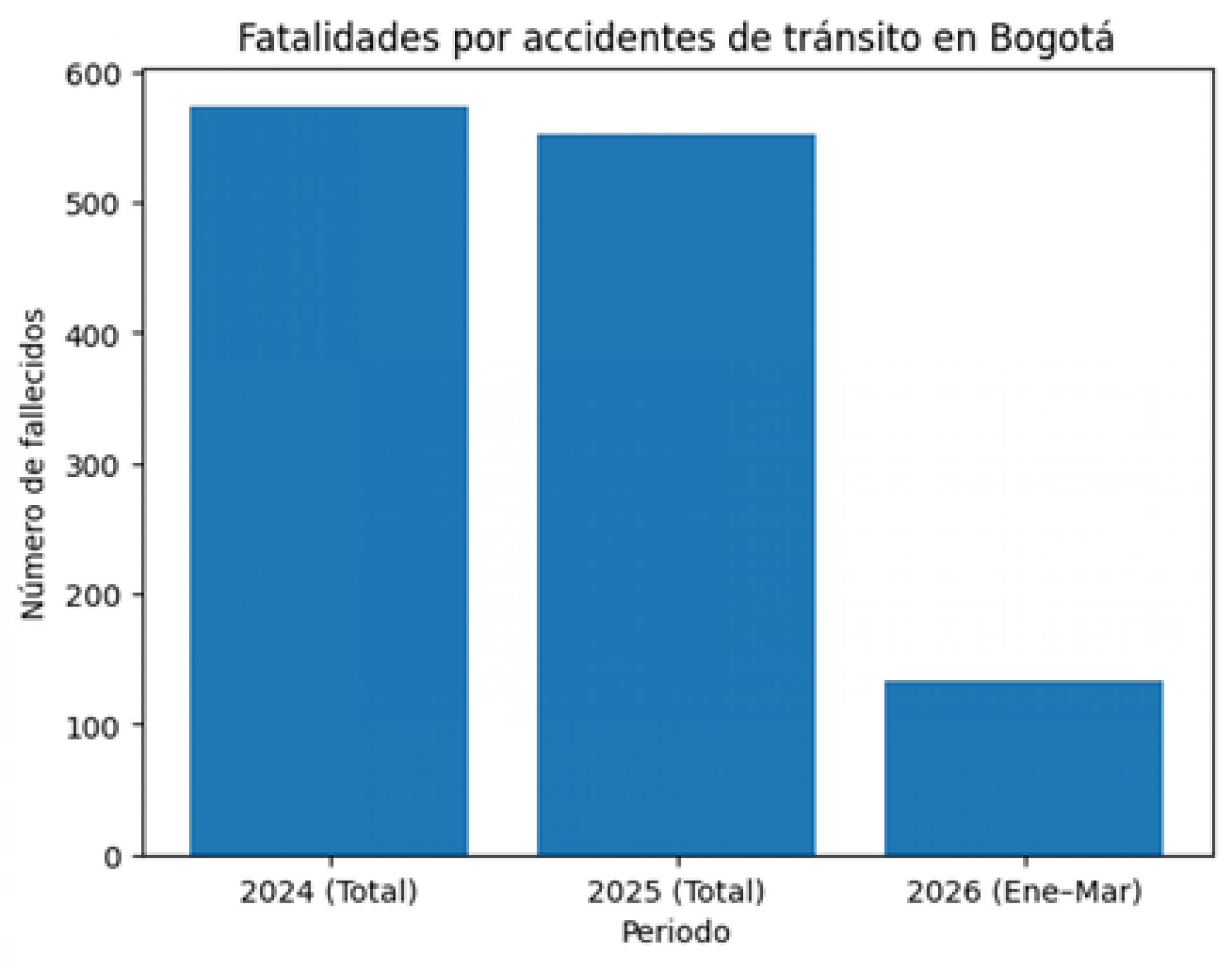 Aunque, según la Secretaría de Movilidad de Bogotá, la fatalidad en accidentes de tránsito se redujo un 4 % para finales de 2025 y se reportaron 552 fallecidos, 22 menos que en 2024, para el primer trimestre de 2026 ha aumentado un 21 % el número con 133 registros hasta la mitad de marzo. Este incremento contrasta con la información preliminar publicada por el Observatorio Nacional de Seguridad Vial, donde Bogotá se posicionó como la ciudad con la mayor reducción de fatalidades viales a nivel departamental y la segunda capital con mayor disminución de muertes después de Medellín.