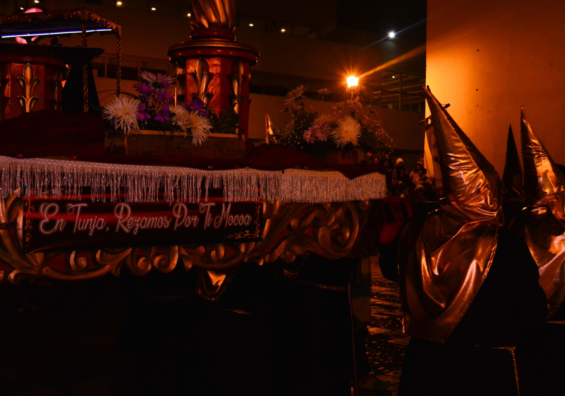 Entre capirotes, túnicas, pies descalzos e incienso se celebra la Semana Santa en la ciudad de Tunja, Boyacá|Uno de los pasos, frente a la Catedral Basílica Metropolitana Santiago de Tunja|Desde los ocho años, niños y niñas acompañan el desfile de penitentes|Durante cerca de dos horas, las procesiones se toman las calles del centro histórico de la ciudad|Con el paso a cuestas, los nazarenos recorren las principales calles del centro histórico de la ciudad|Orden de los Caballeros del Santo Sepulcro|Al son de dos golpes con el hachote, los penitentes se preparan para avanzar nuevamente|La procesión se lleva a cabo con los pies descalzos|Banda heráldica de la Primera Brigada de la Policía Militar, acompañando la proseción de la Sociedad de Nazarenos||Como en suComo en sus inicios hacia el siglo XVI, actualmente la procesión se lleva a cabo con los pies descalzos. No obstante, niños y niñas pueden usar sandalias||Con el paso a cueAlgunas de las instituciones educativas y sus bandas heráldicas también participan del desfile|Los orígenes de esta tradición datan de 1607. Los cargueros más antiguos señalan que se mantienen las características iniciales de la procesión||En Tunja rezamos por ti, Mocoa|||||||