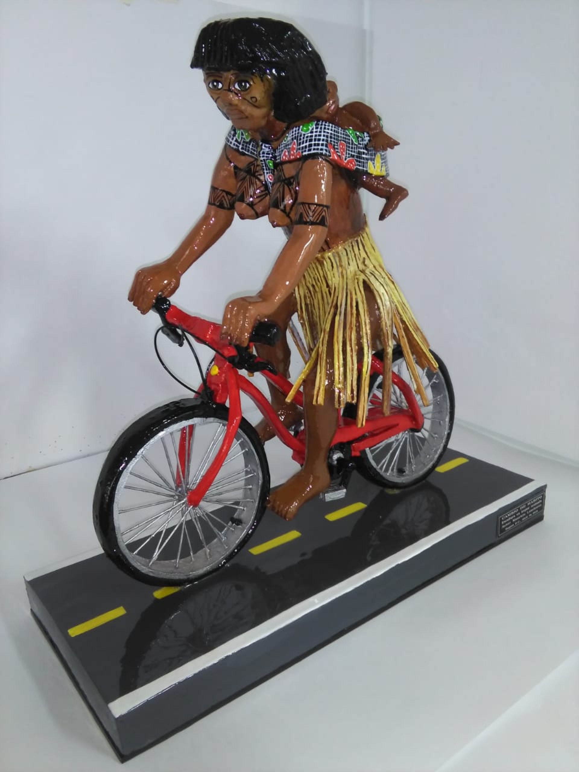 La pieza muestra a una mujer indígena en bicicleta cargando a su hijo en la espalda. Lancheros usó una técnica mixta entre icopor y cobertura en yeso. El proceso de creación duró un mes aproximadamente.