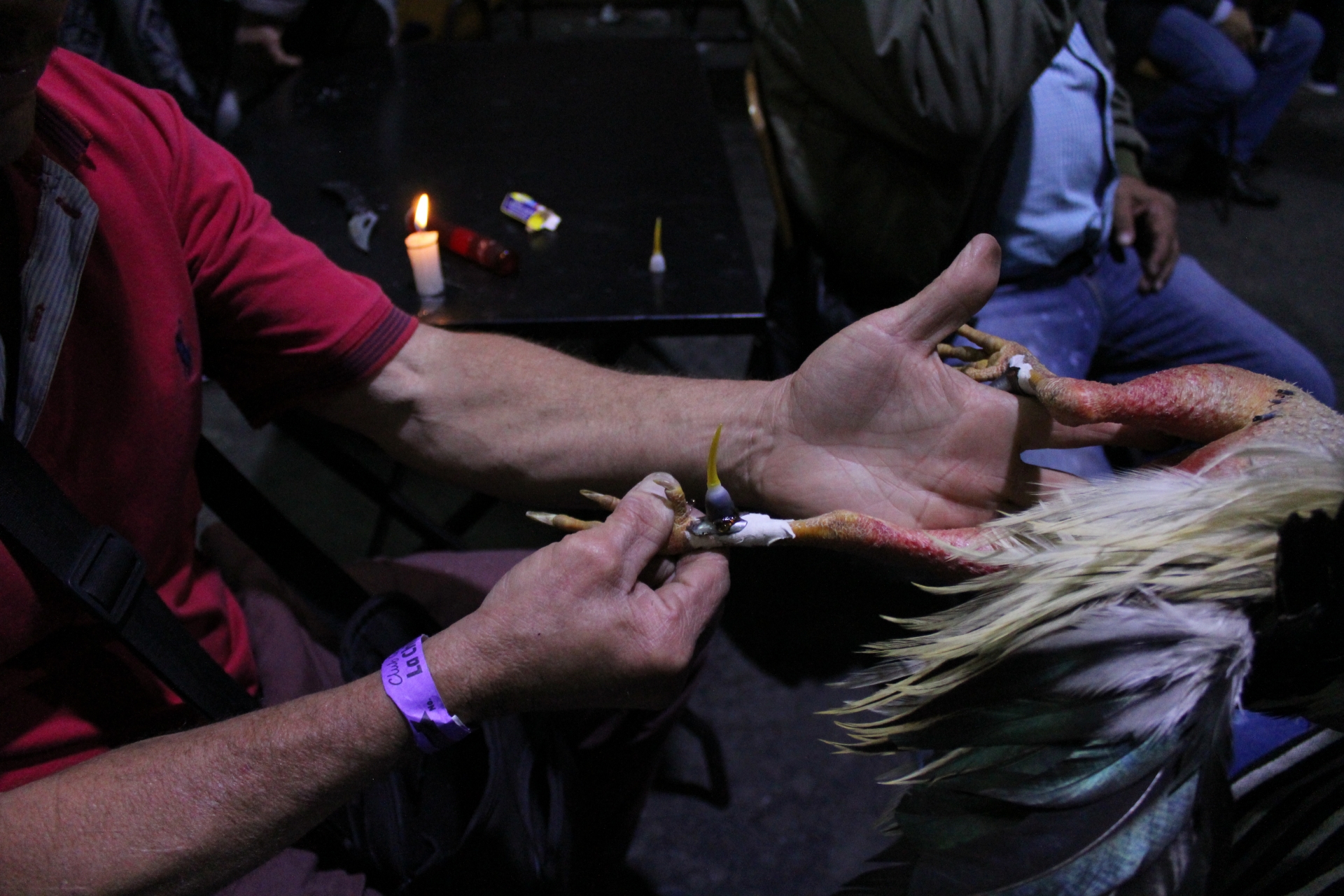En una báscula se comienza a pesar cada uno de los gallos y así según el peso encontrar su respectivo contrincante en el ring. Los dueños de cada gallo se ubican en diferentes mesas para prepararlos para las peleas, forrando sus patas con esparadrapo para poder pegar con cera caliente las espuelas.