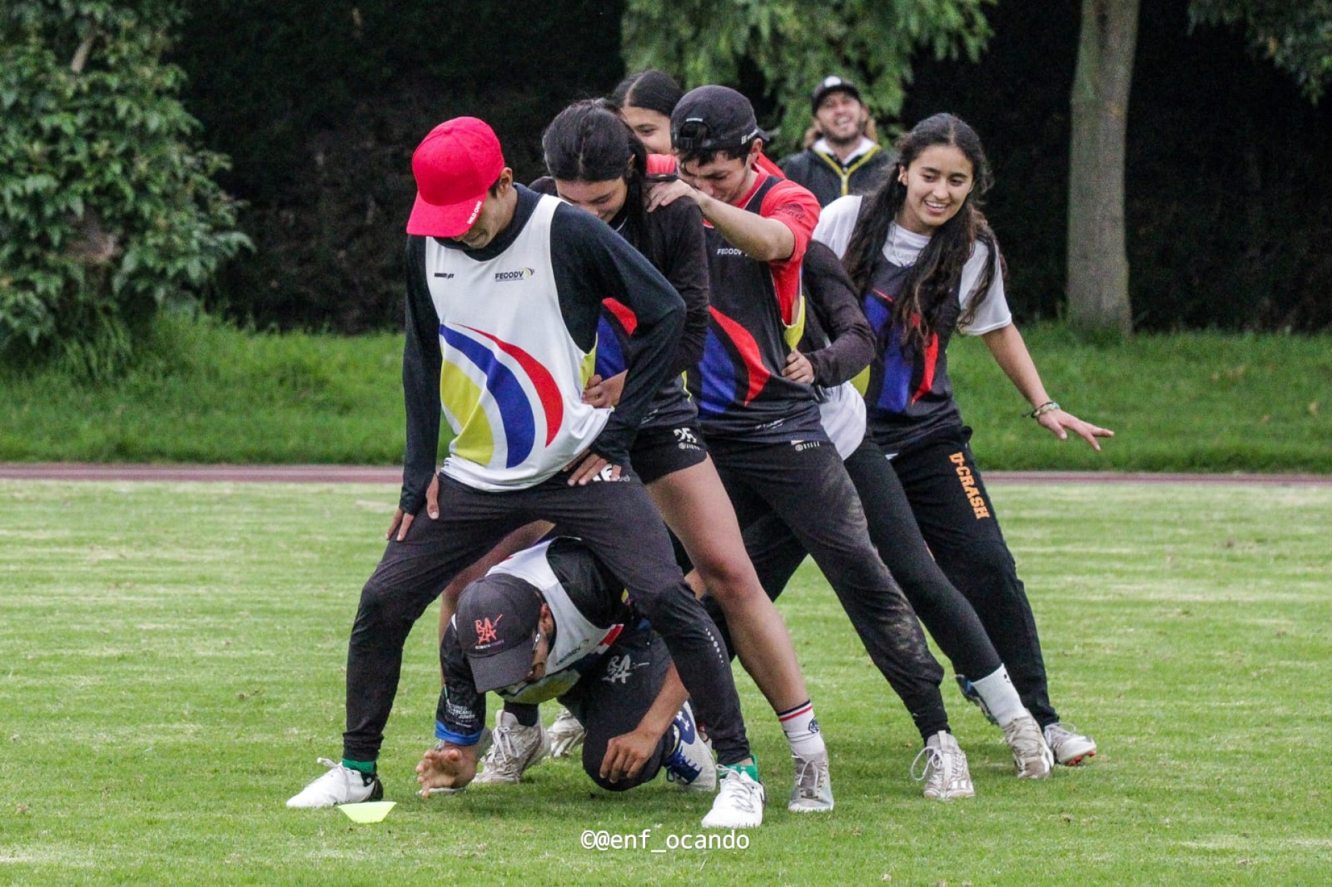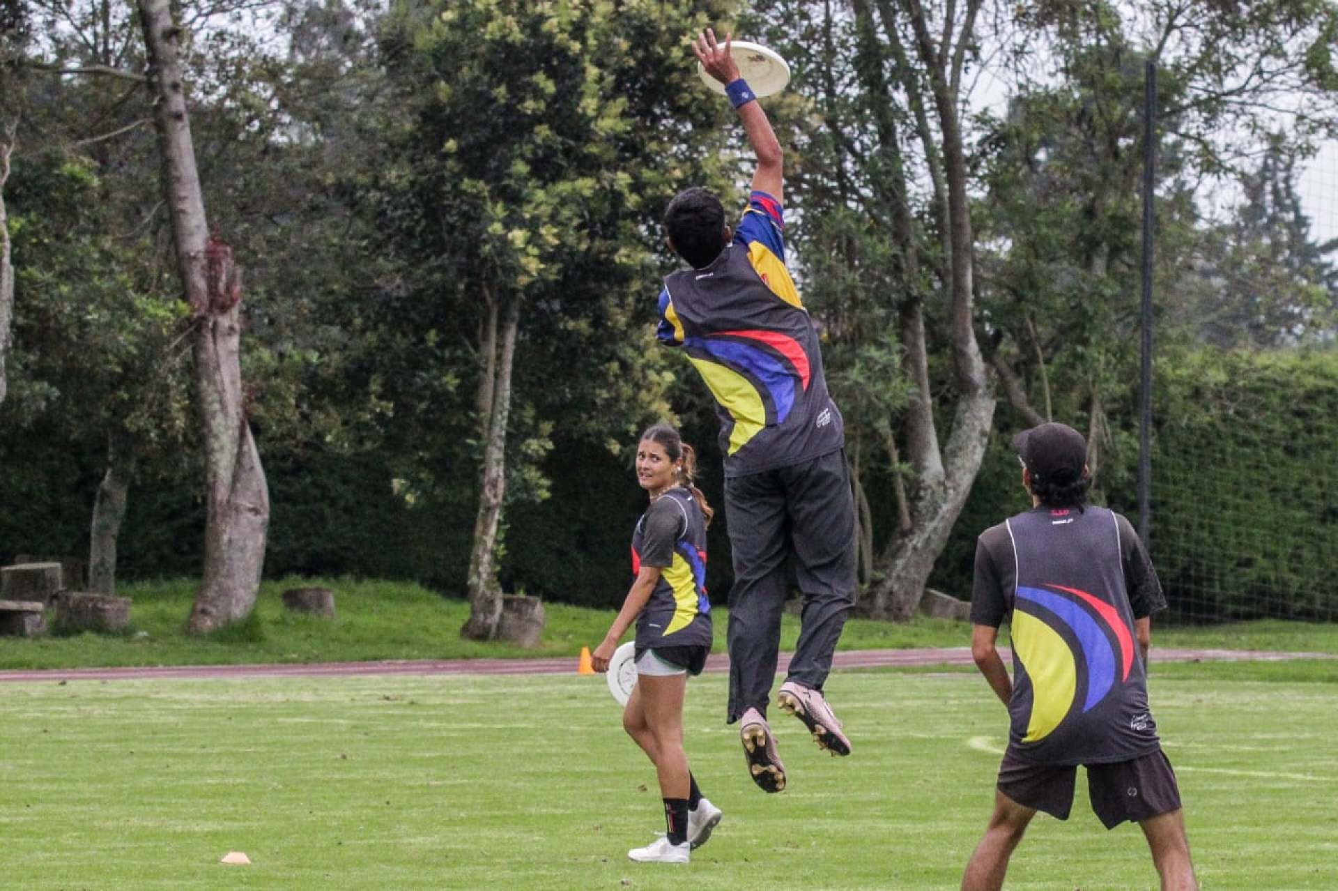 Una tarde bogotana: poco sol, el cielo nublado y de vez en cuando una que otra gota cae sobre el césped del campus de la UniCervantes. Las risas, gritos y el sonido del golpeteo de los taches sobre el suelo inundan todo el campo de fútbol. Las tres ramas de la Selección Colombia sub 24 de ultimate hacen una actividad juntas para sentirse cada vez más como una sola, como una delegación que representará al país en un mes.
